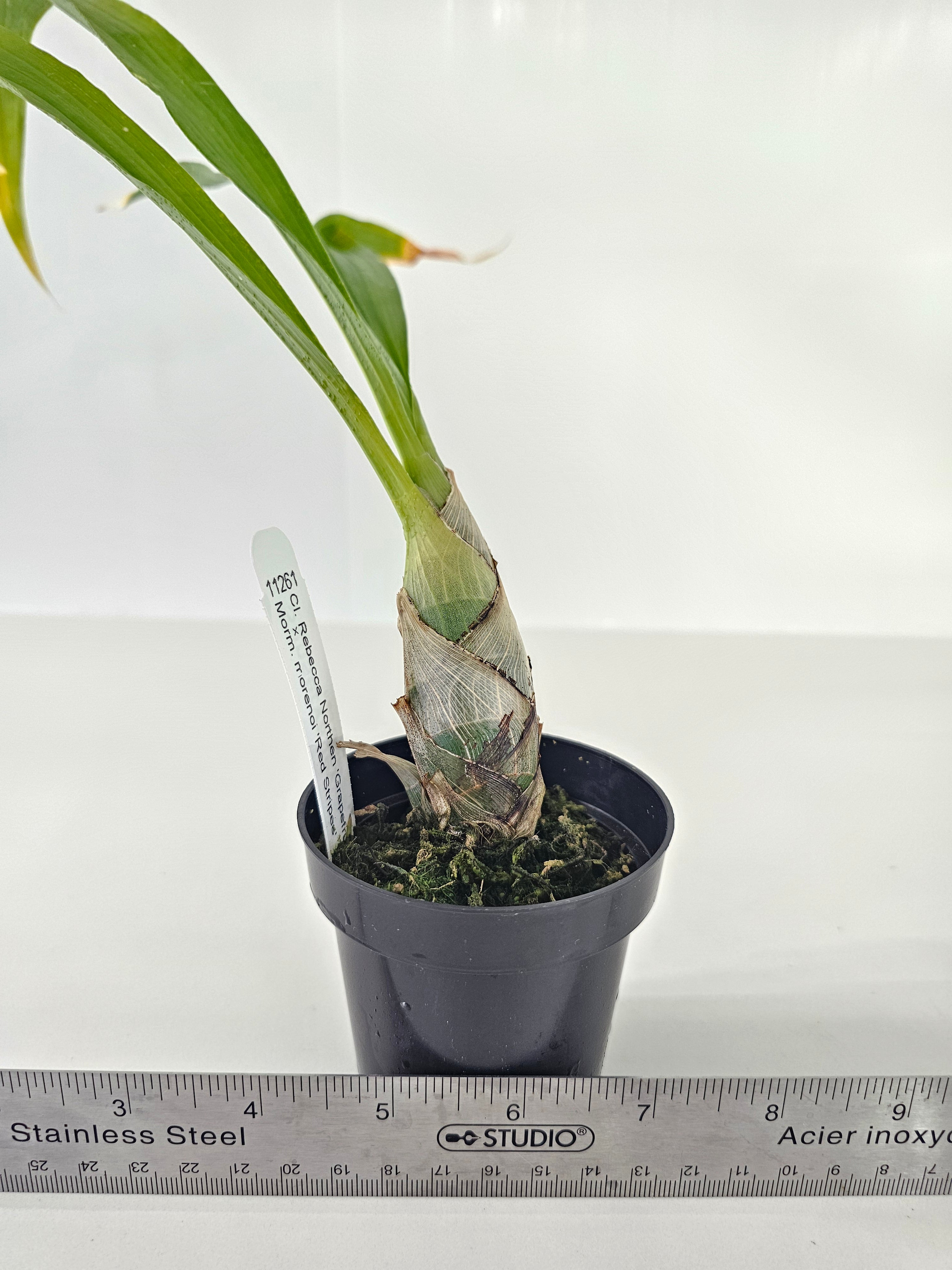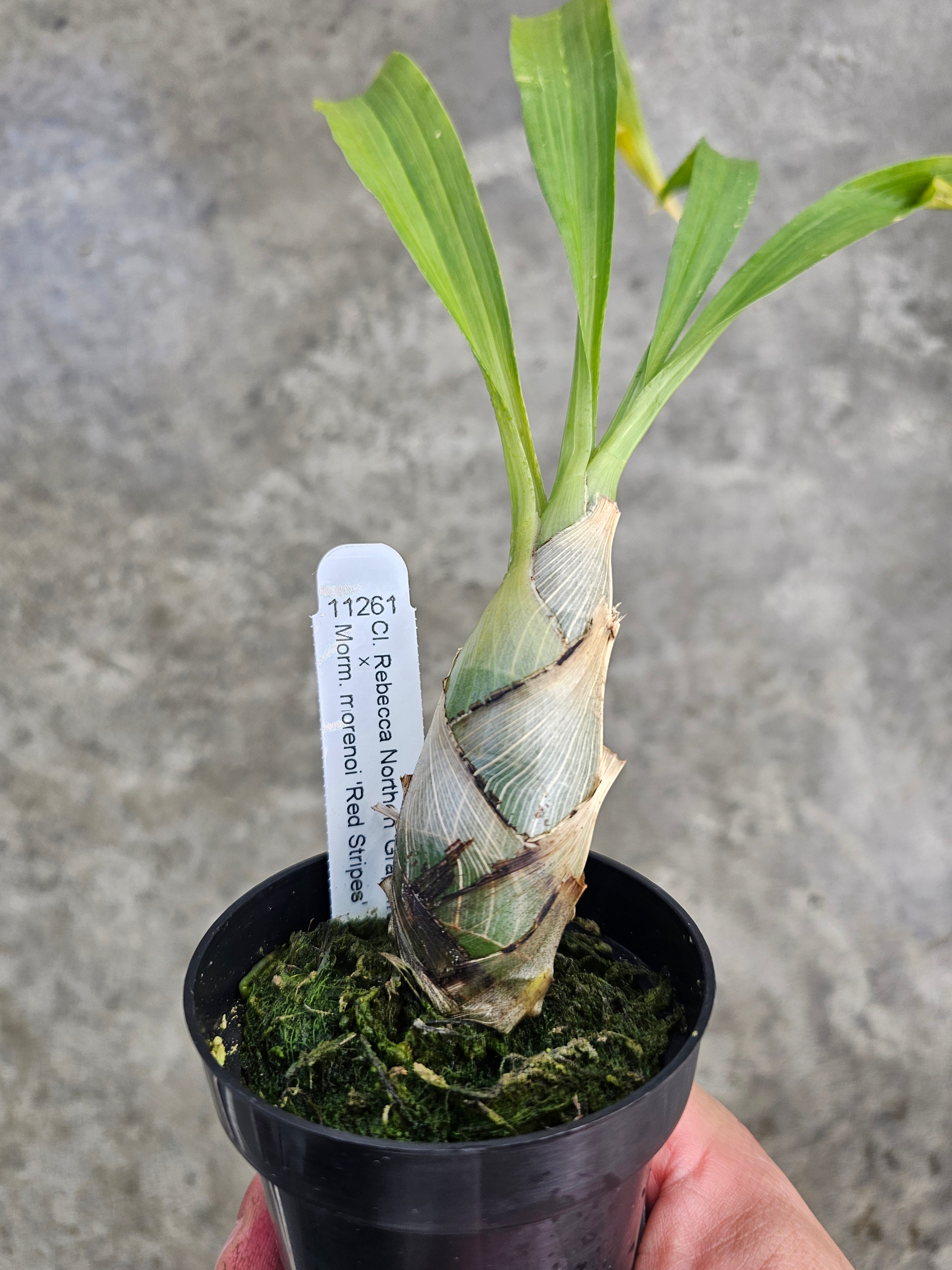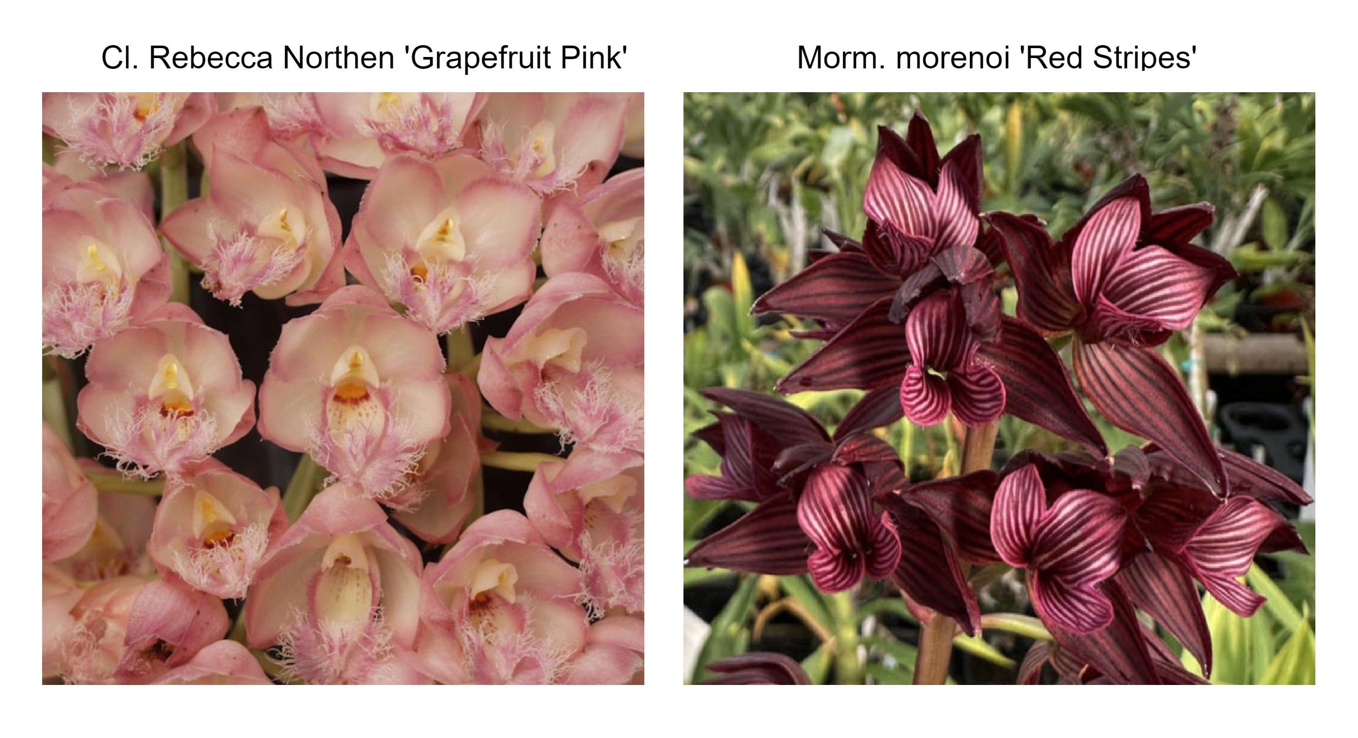 Mormodias (Mo.) are easy to grow and make great late season bloomers. Rebecca Northen 'Grapefruit Pink' produces 20 or more frilly, pink flowers on each of 3-4 pendulous inflorescences from leafless bulbs in mid-winter. Morm. morenoi has attractive red-striped flowers. This native of Bolivia has a small plant stature, standing 6-8” tall, and is rarely seen in cultivation. In this style of breeding the Mormodes will be dominant for color and the Clowesia for shape. Expect the offspring to be small plants - mini-Mormodias. Flowers will be red with dark red stripes, and plants will produce 2-3 inflorescence with 15+ flowers each. This is a super cool new direction in breeding.
