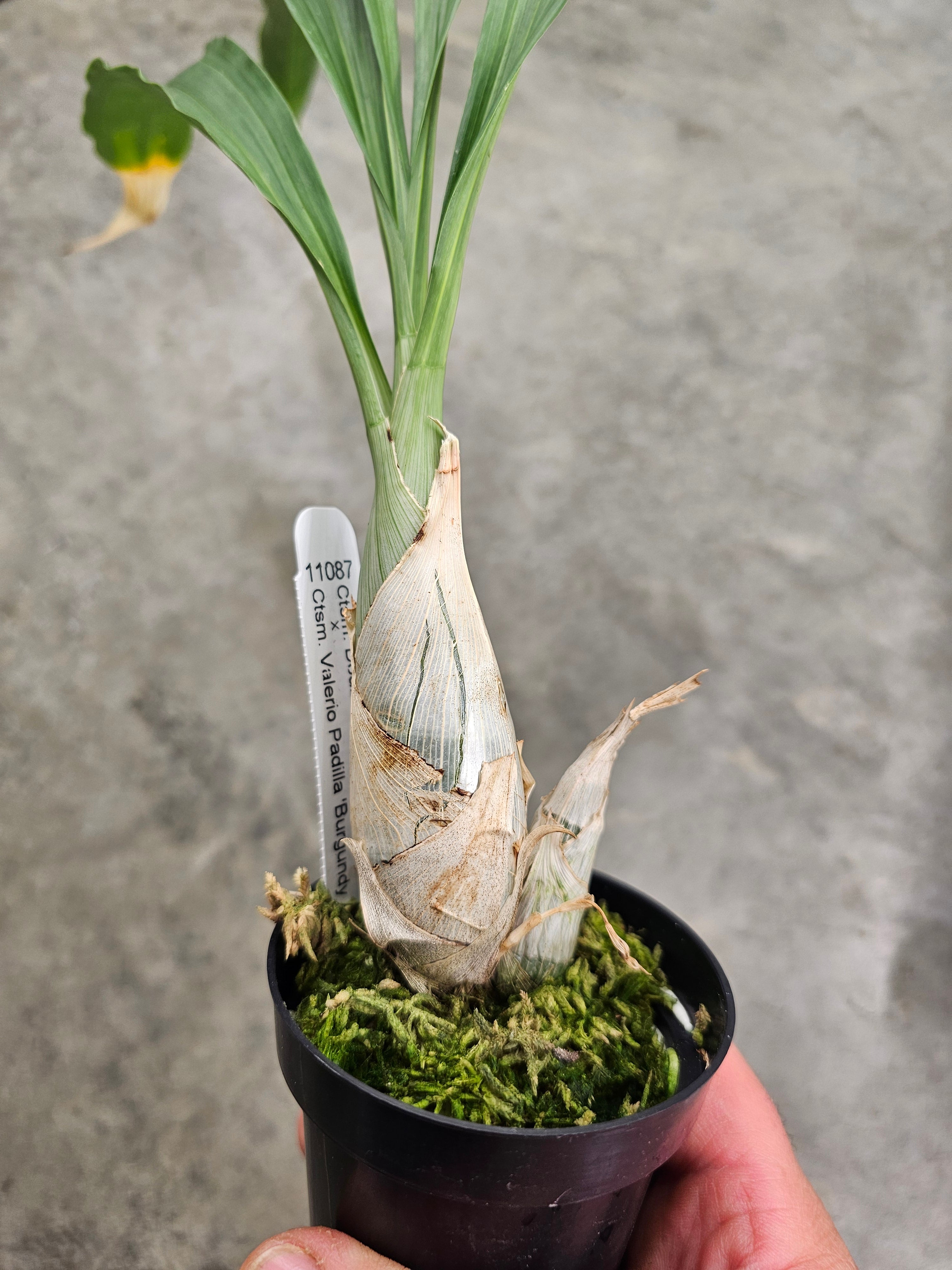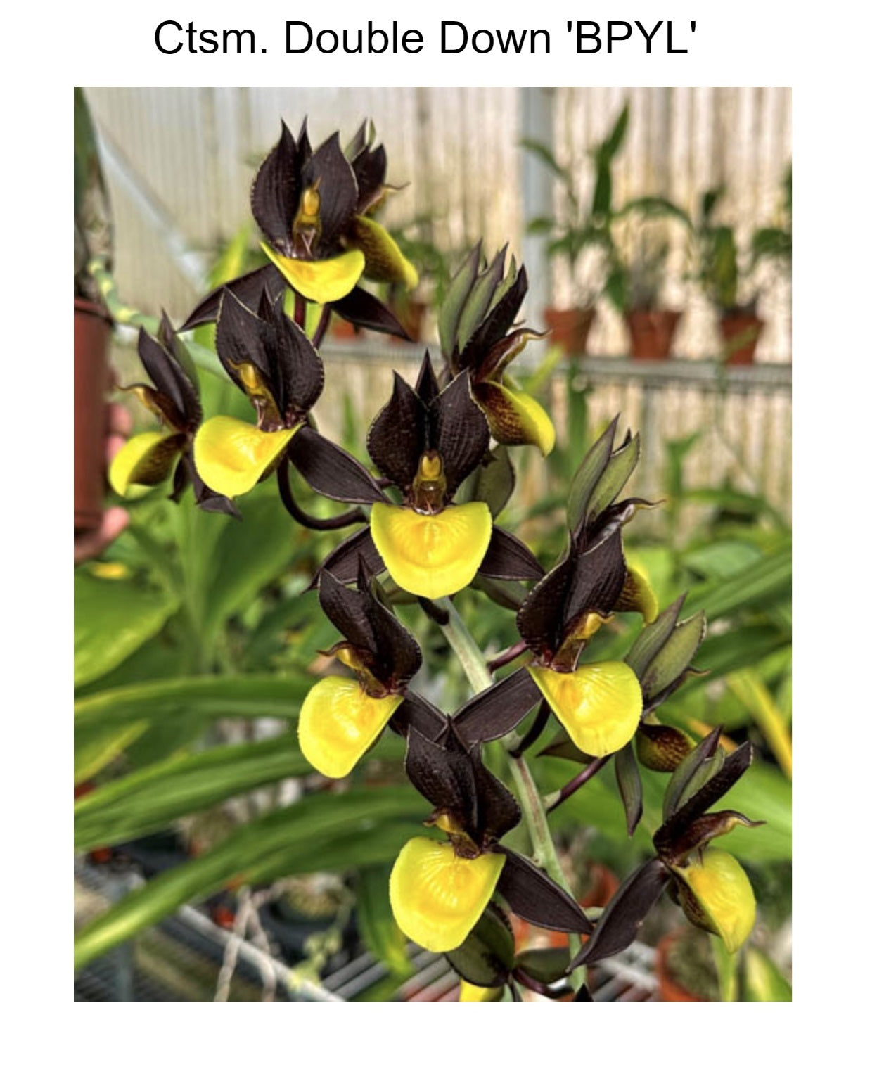 Ctsm. Double Down (Ctsm. Chuck Taylor x Ctsm. kleberianum) 'BPYL' is named for its Black Petals and Yellow Lip. Its excellent color plus 15-17 flowers on a stem blooming twice a year make this a good candidate as a parent. Valerio Padilla (Ctsm. Melana Davison x Ctsm. Isobel's Sunshine) has flowers with a fantastic color contrast, deep burgundy petals, and sepals with a bright yellow lip. When both of these plants are blooming the flower color draws you in for a closer look, even if you are across the greenhouse! That's what inspired the making of this cross. The progeny from this mating will bloom with dark, almost black petals and sepals, contrasted with bright yellow frilly lips. Plus, plants will flower with 15-20 well arranged blooms 2-3 times a season.