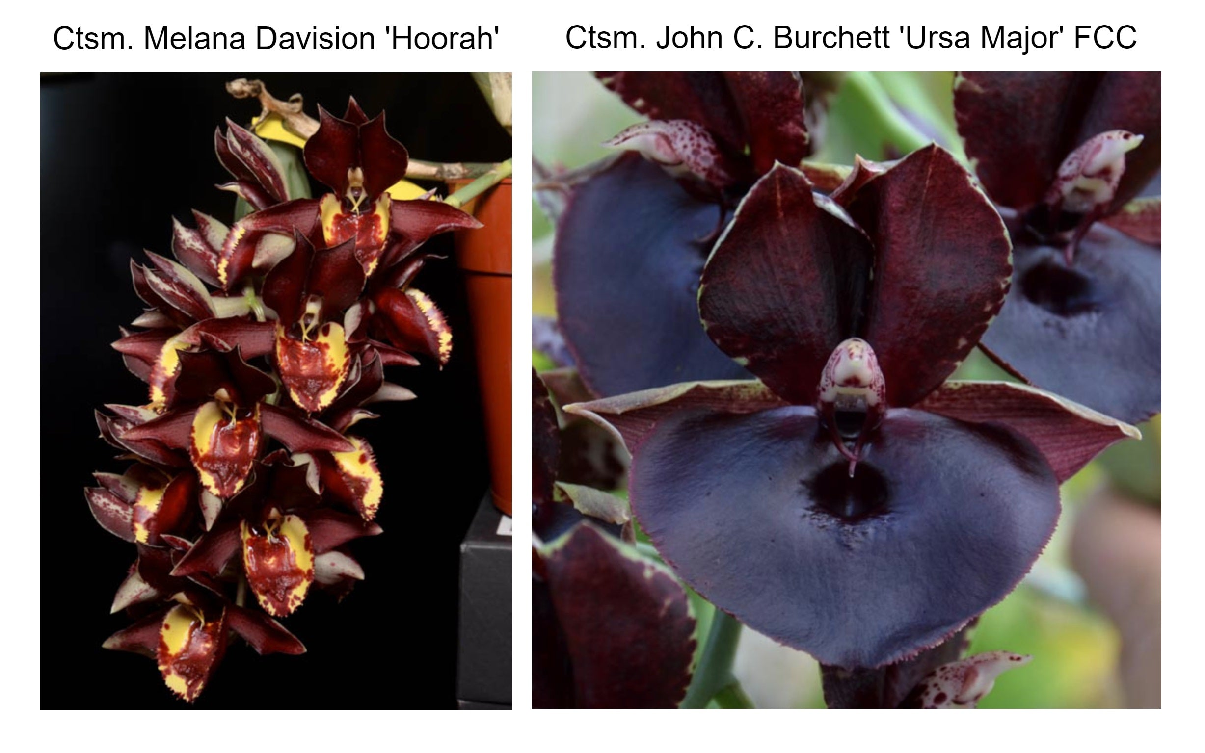 Melana Davison (Ctsm. denticulatum x Ctsm. Penang) 'Hoorah' has red flowers with yellow lips blotched in red. Ctsm. John C. Burchett (João Stivalli x Susan Fuchs) is a spectacular hybrid. The huge, flat, nearly black lip of the cultivar 'Ursa Major' really impressed the judges, and this plant received a First Class Certificate (FCC/AOS) for Ryan Kowalczyk. 'Ursa Major' blooms 2-3 times a year. With this hybrid we are combining a mini with a standard sized Catasetum looking for smaller plants with large flowers. The flower color will be in dark burgundy reds, with broad flat lips, some with spotting. Expect excellent arrangement from plants that bloom 2-3 times a year.
