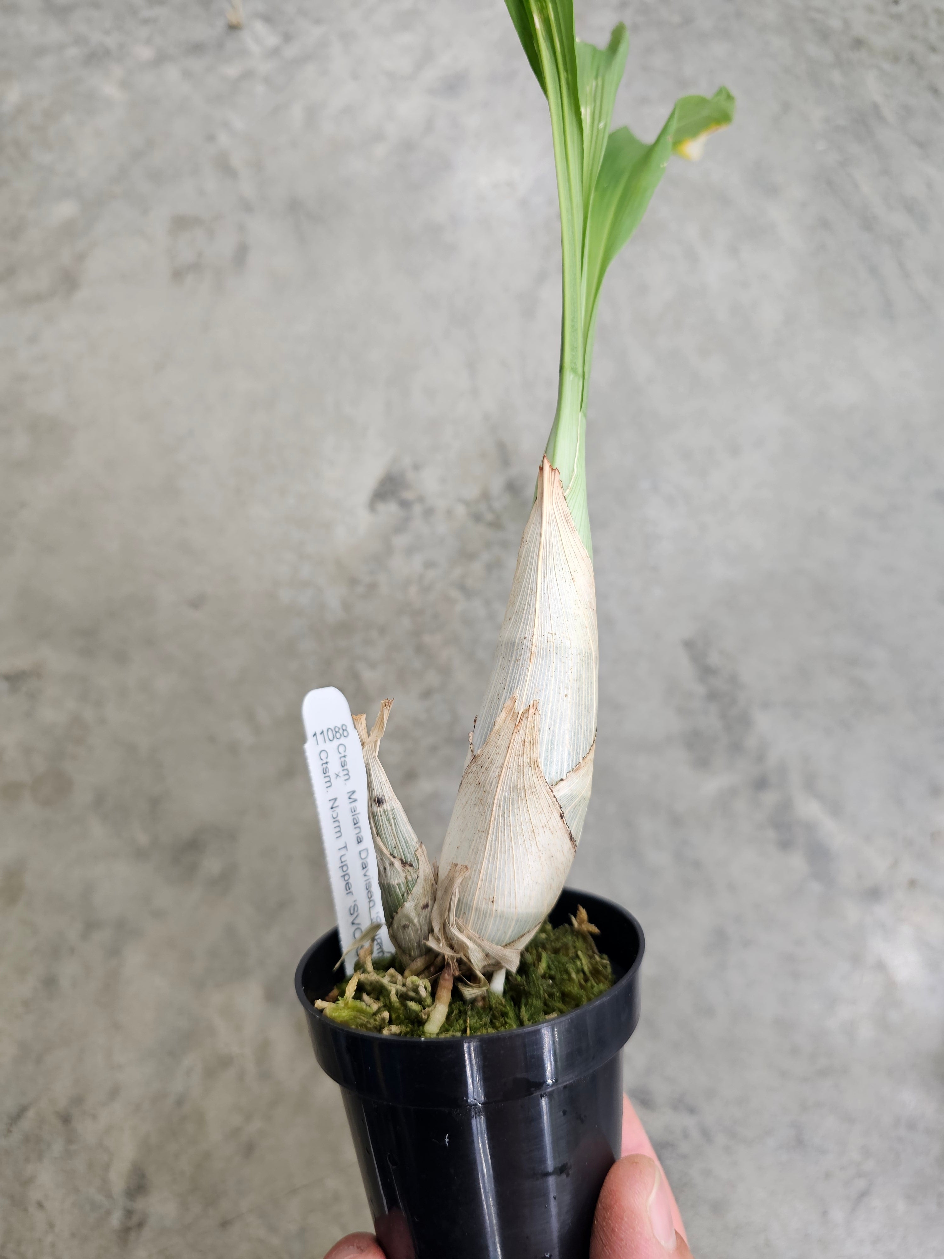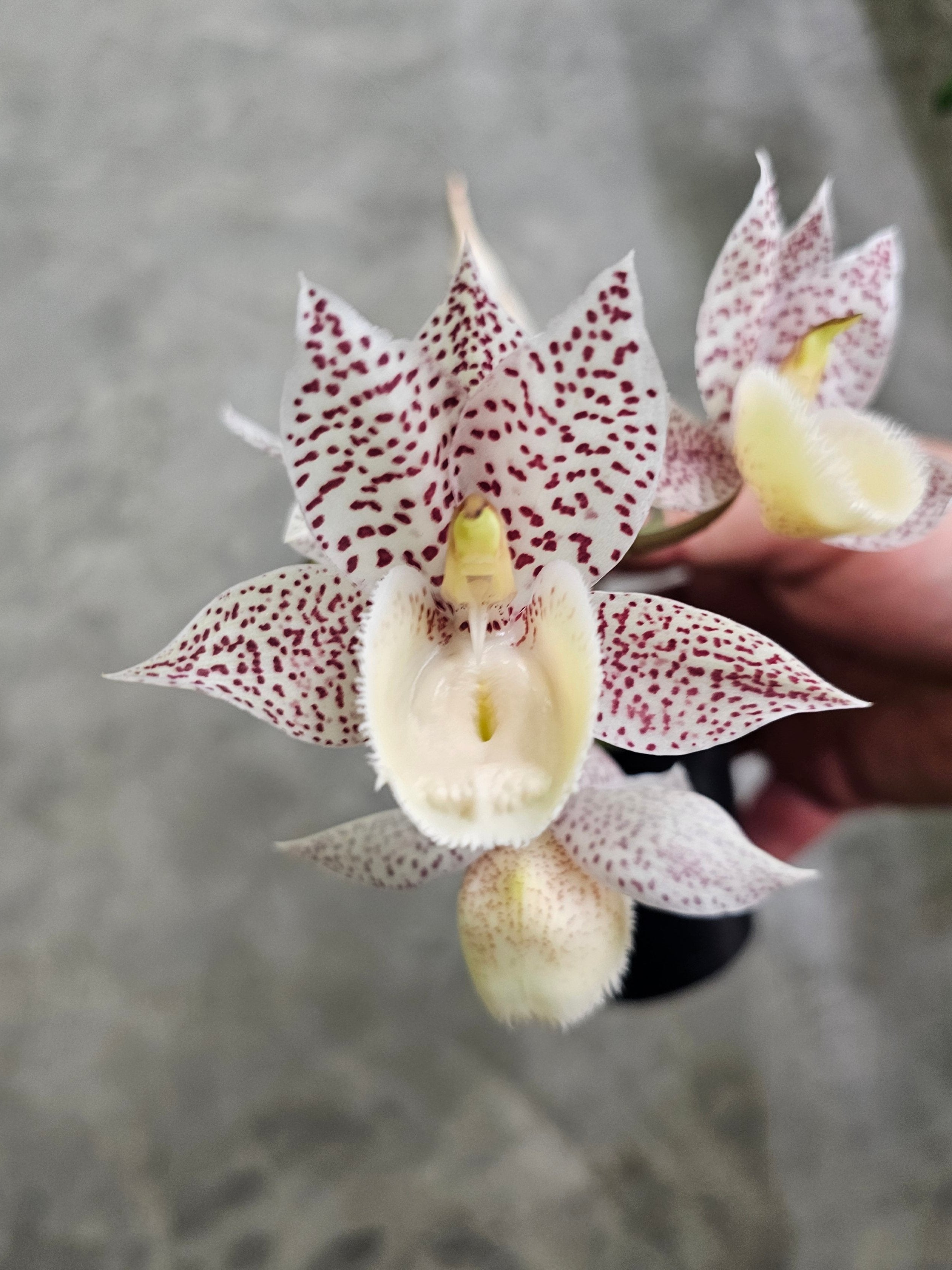 We admire the attractive combination of flower colors in these two parents. This cultivar of Melana Davison (Ctsm. denticulatum x Ctsm. Penang) is one of the most beautiful, with perfectly-arranged pure white flowers with a slight peppering of red on the petals. Norm Tupper (Ctsm. Portagee Star x Ctsm. tigrinum) has fabulous white flowers peppered with red spots and a pure white fimbriated lip. This cross is all about improving the white flowers with red spots color combination, flower shape and arrangement, and frequency of blooming. These are mini-Catasetums.