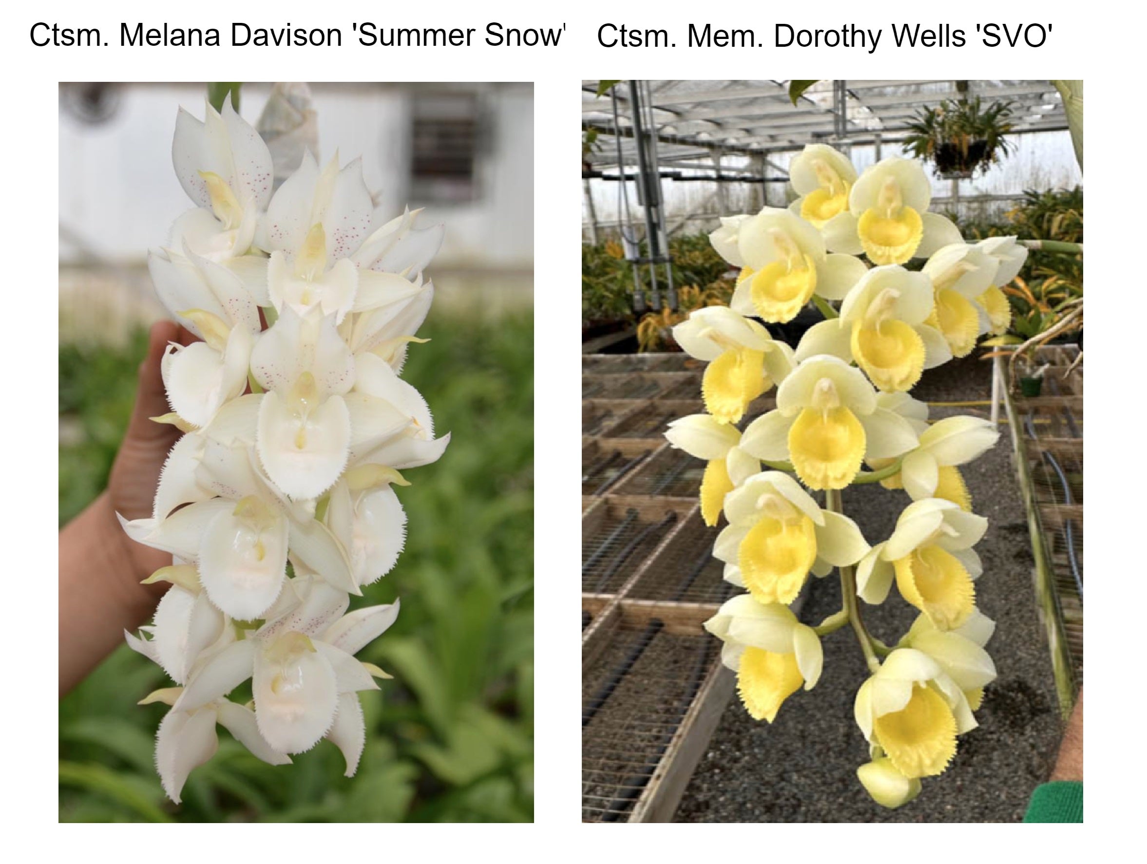 The flowers of Ctsm. Melana Davison (Ctsm. denticulatum x Ctsm. Penang) come in many different colors, but one of the most beautiful is 'Summer Snow' with its perfectly-arranged, pure white flowers with a slight peppering of red on the petals. This outstanding mini-Catasetum blooms 3-4 times a season! Mem. Dorothy Wells (Ctsm. Dentigrianum x Ctsm. Chuck Taylor) 'Honey Tree' was recently awarded, and we renamed the plant 'SVO' AM/AOS as seen in the photo. It has exceptional flowers, beautifully arranged in an amazing color combination of pure white with a yellow lip. This cross is aiming to advance the white flower with yellow lip color combination. Many of these will bloom as predicted; however, some will have fine red spots, others will be blotched in red, and a few might even come out in solid colors. All will have 15-25 well-arranged flowers of excellent shape blooming 2-3 times a year.