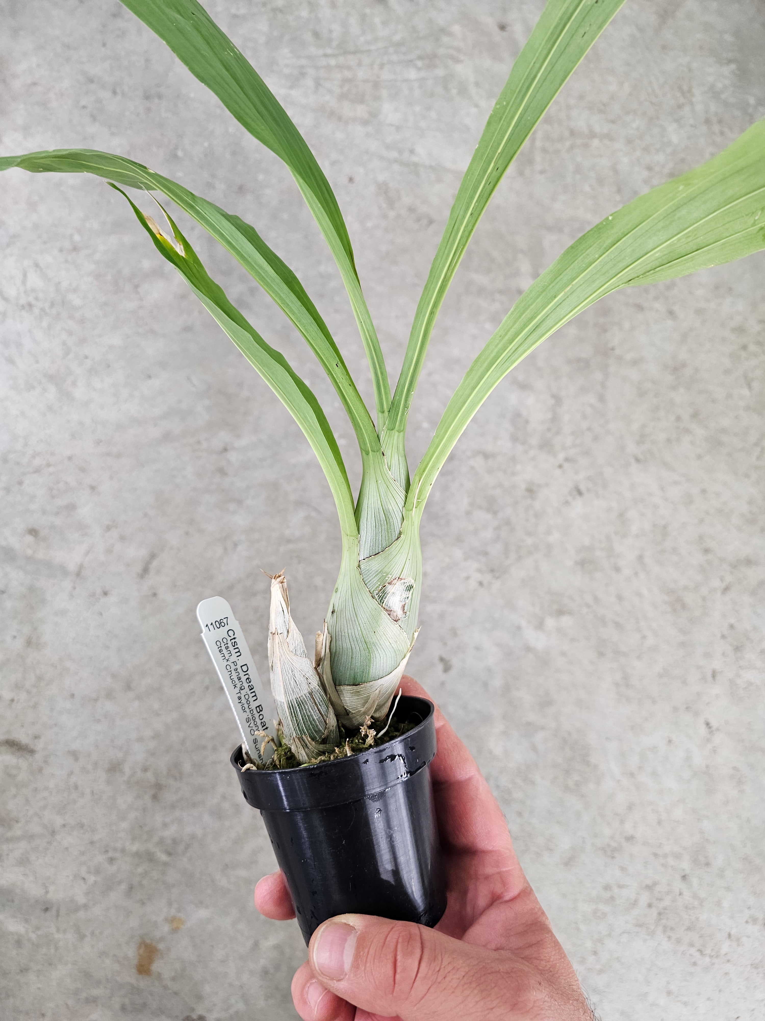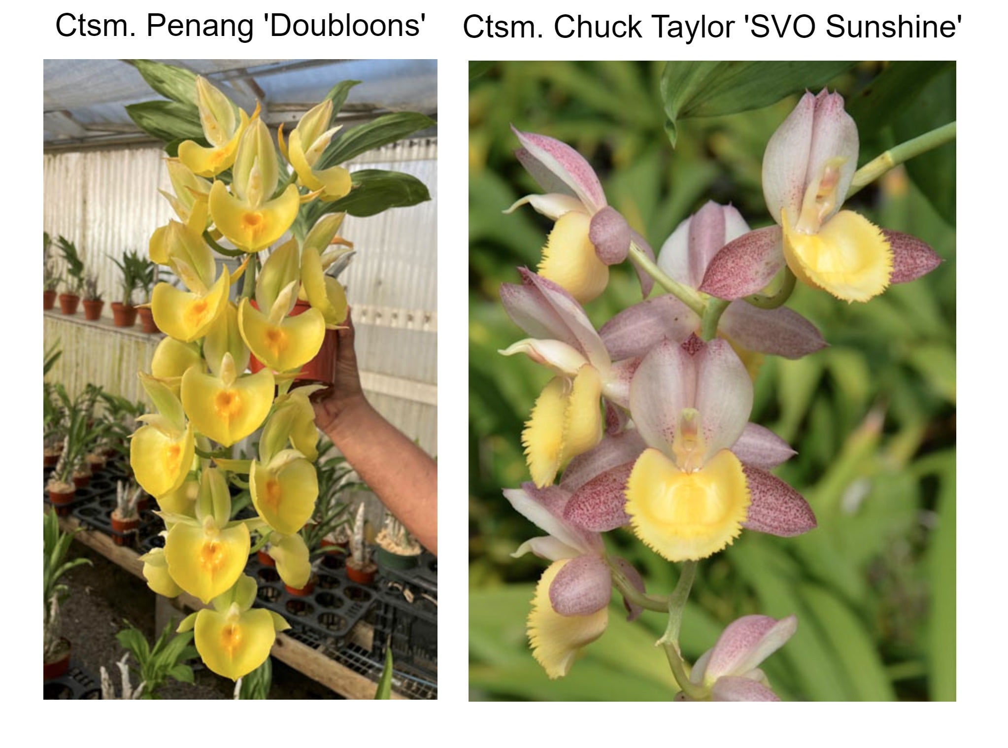 We first offered this successful hybrid in 2015. Ctsm. Penang (Ctsm. Susan Fuchs x Ctsm. pileatum) is responsible for producing some very successful mini-Catasetum hybrids. We predicted that crossing it with Ctsm. Chuck Taylor (Portagee Star x denticulatum) would give excellent results, and the first batch of Ctsm. Dreamboats confirmed our expectations. Ctsm. Penang 'Doubloons' can bloom with more than 20 large yellow flowers, and Chuck Taylor has beautiful flower color and blooms 2-3 times each season. With this hybrid, we expect large flower size with only a modest increase in plant size. Flowers will have wide, full lips and bloom 2-3 times a season, with flowers that will range from yellow to yellow and pink, with a few in burgundy. This is a very robust growing cross with superior vigor.