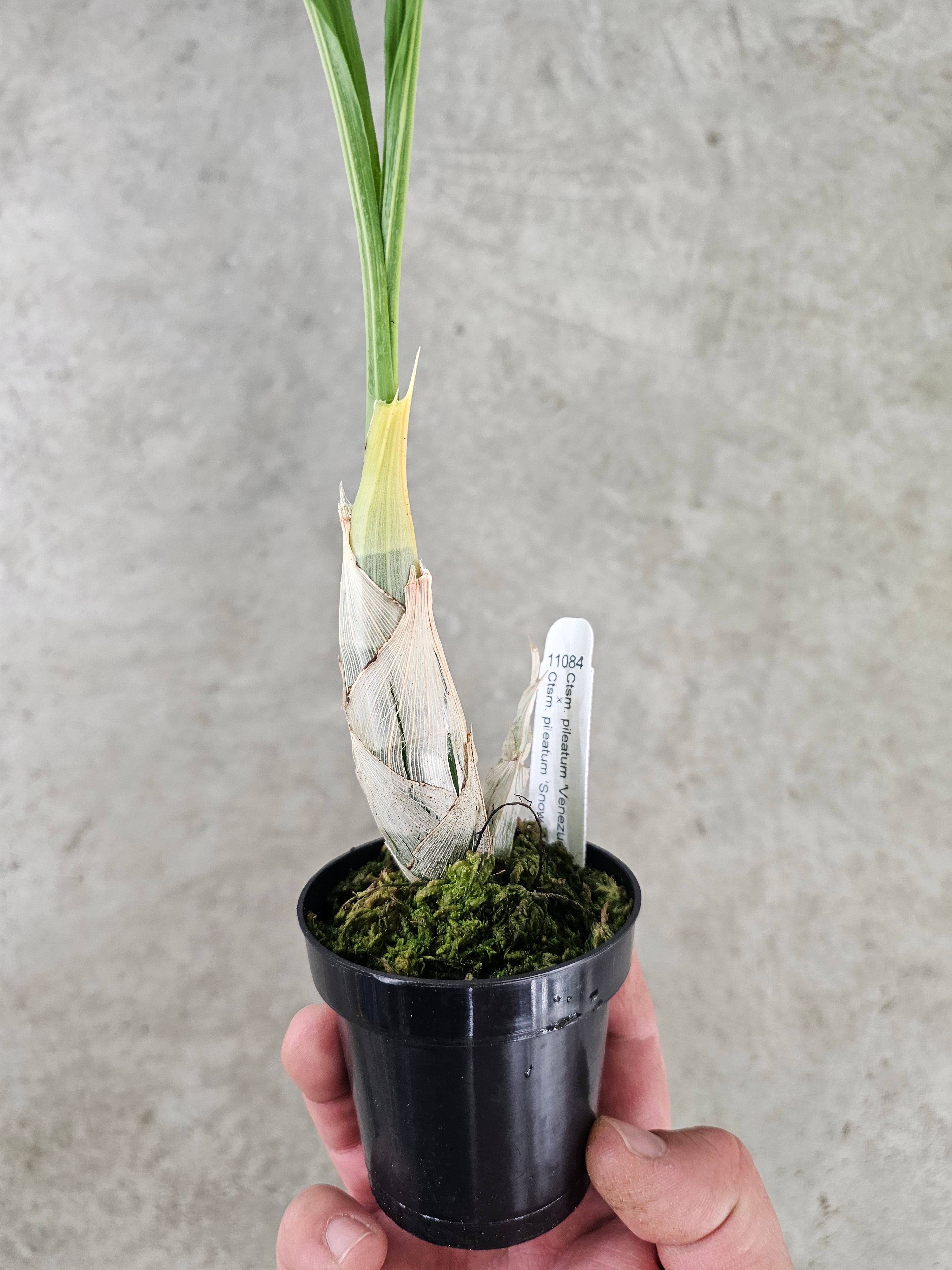 We were fortunate to have several pileatum bloom with female flowers – it's been quite a while since that happened. Luckily for everyone, we now have available several 'tipo' (typical flower color) plants of this desirable species. The cultivar 'Venezuela' was wild collected in Venezuela years ago by the late Alexis Pardo, and 'Snow White' was exhibited by James Pluskota in 2014 and received an FCC/AOS, indicating its flower quality. This pairing is going to deliver some outstanding offspring. Get these now!
