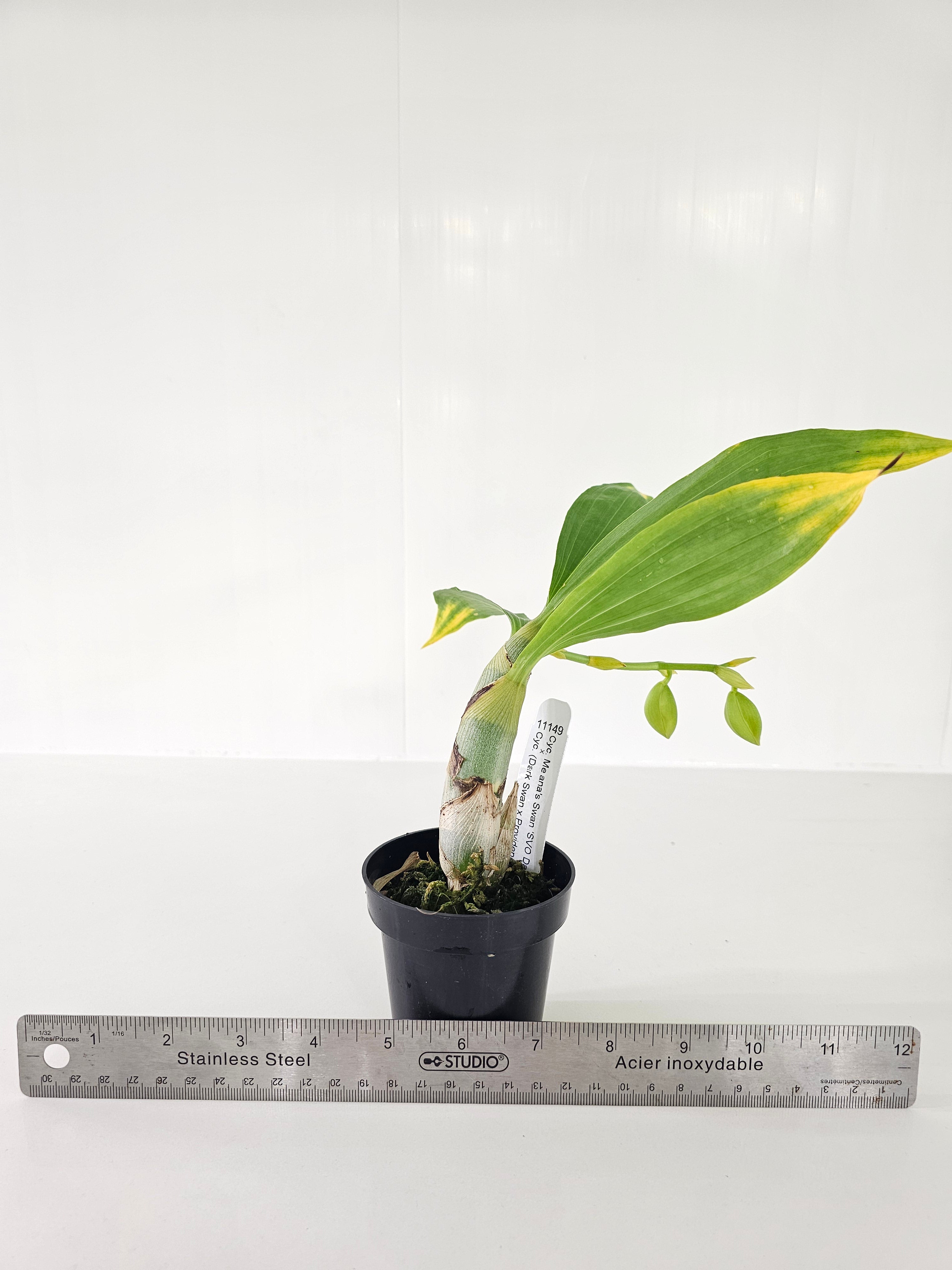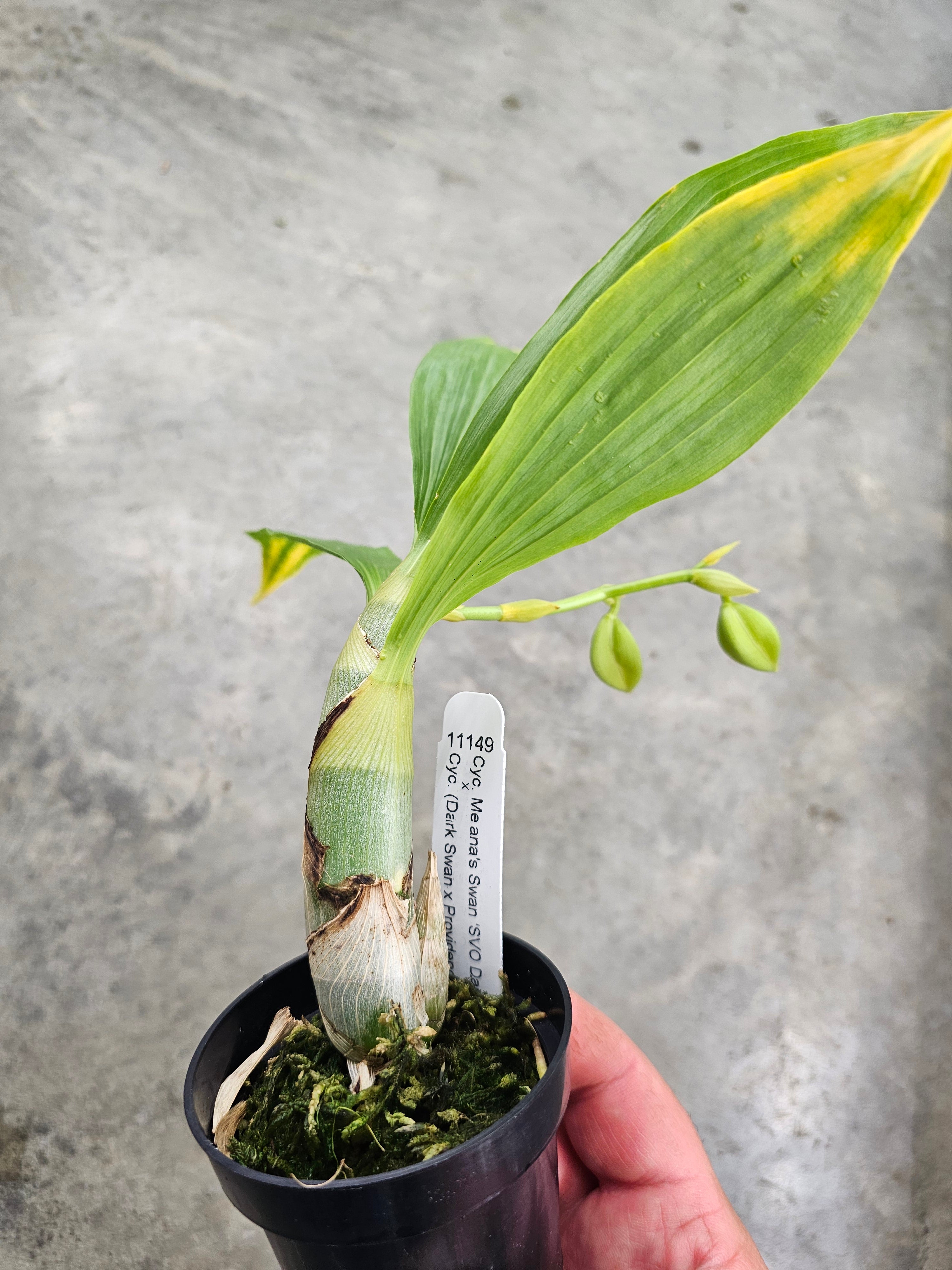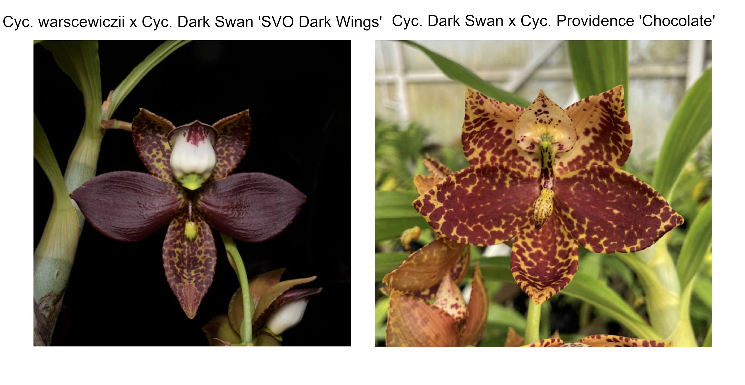 Cyc. Melana's Swan (Cyc. warscewiczii x Cyc. Dark Swan) has a large flower due to the high percentage of Cyc. warscewiczii genes in its background. The flower color of 'SVO Dark Wings' is spectacular, with petals in solid dark burgundy, deeply spotted dorsal & lateral sepals, and a contrasting white lip! The not-yet-registered (Cyc. Dark Swan x Cyc. Providence) 'Burgundy Lake' is also spectacular, with petals in solid dark burgundy and a contrasting white lip with burgundy spots! This cross will give us large flowers with 12-15 blooms per inflorescence, shield-shaped lips, and flower colors in dark chocolate. Some might even be the elusive black.