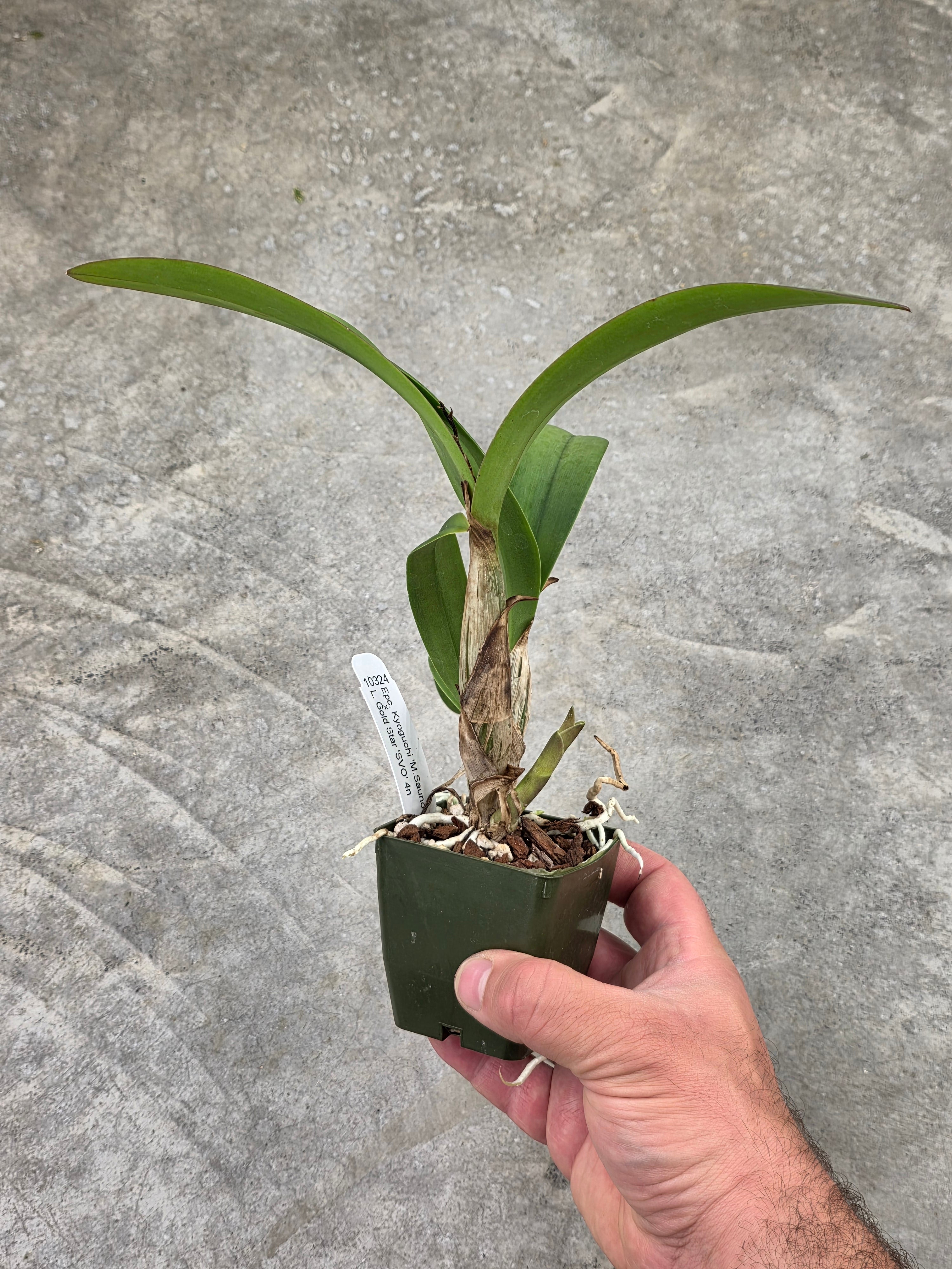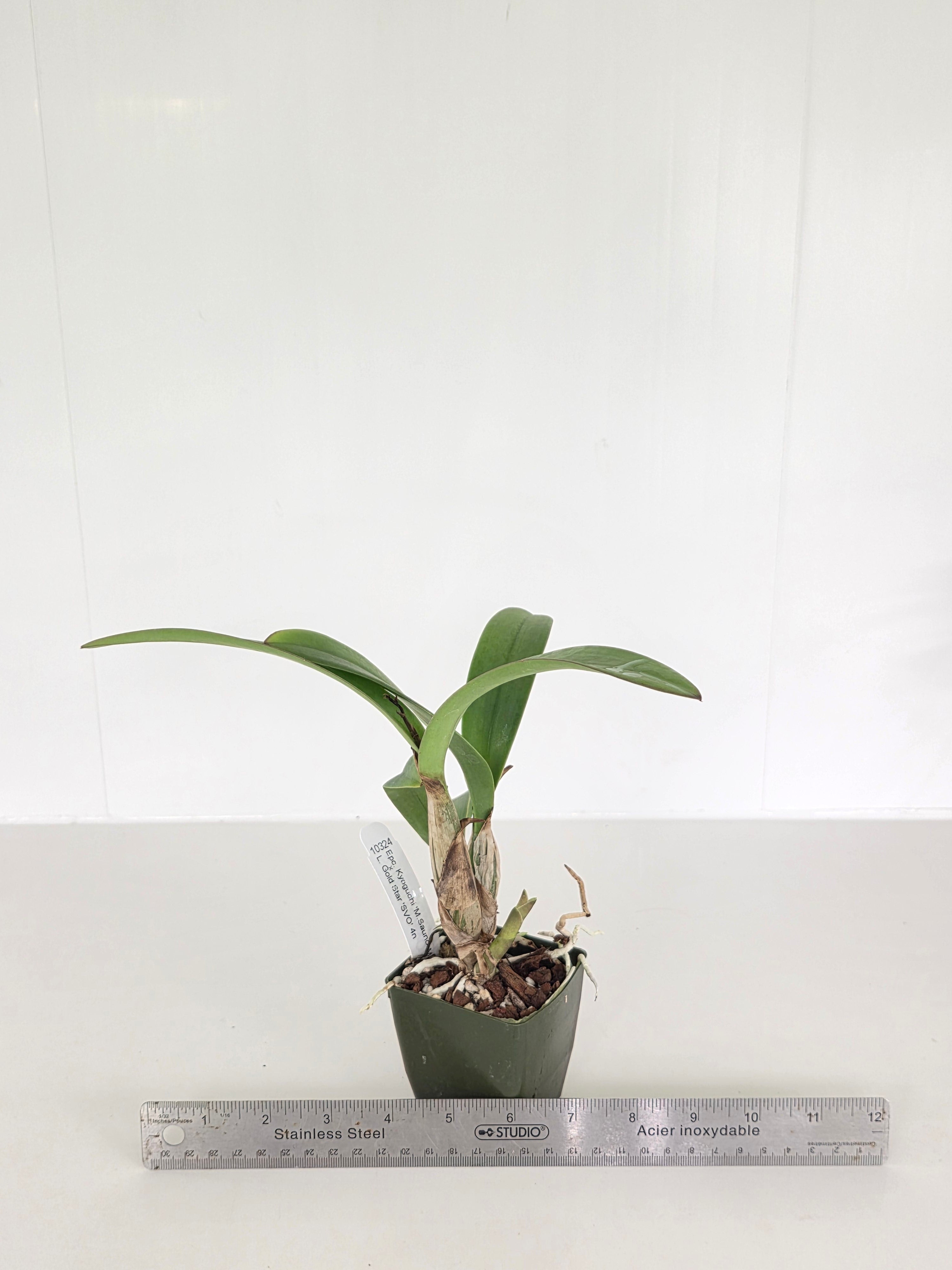 Kyoguchi hybrids are excellent growers, quick to bloom, produce lots of flowers, and are most often fragrant, all noteworthy features in a good orchid. Kyoguchi (C. aurantiaca x E. incumbens [=aromatica]) blooms with 50-60 yellow, fragrant flowers on branched stems – very impressive. This tetraploid Gold Star (L. crispata [flava] x L. harpophylla) has flowers with heavy substance presented well on upright stems. This cross will produce lots of yellow flowers with a fragrance reminiscent of the incumbens grandparent on strong stems from a compact plant.