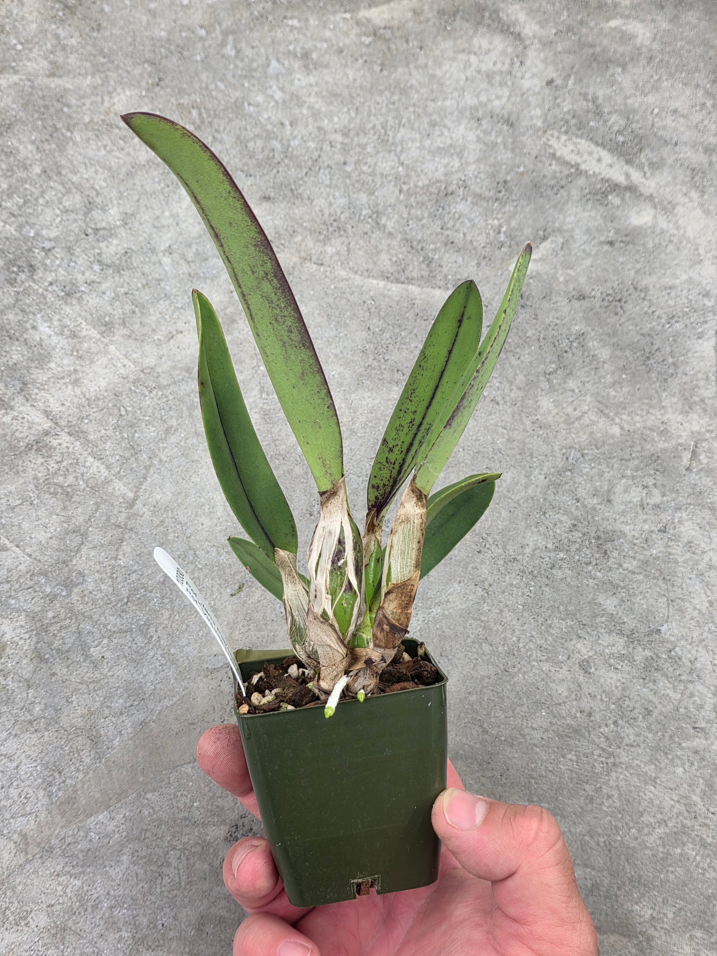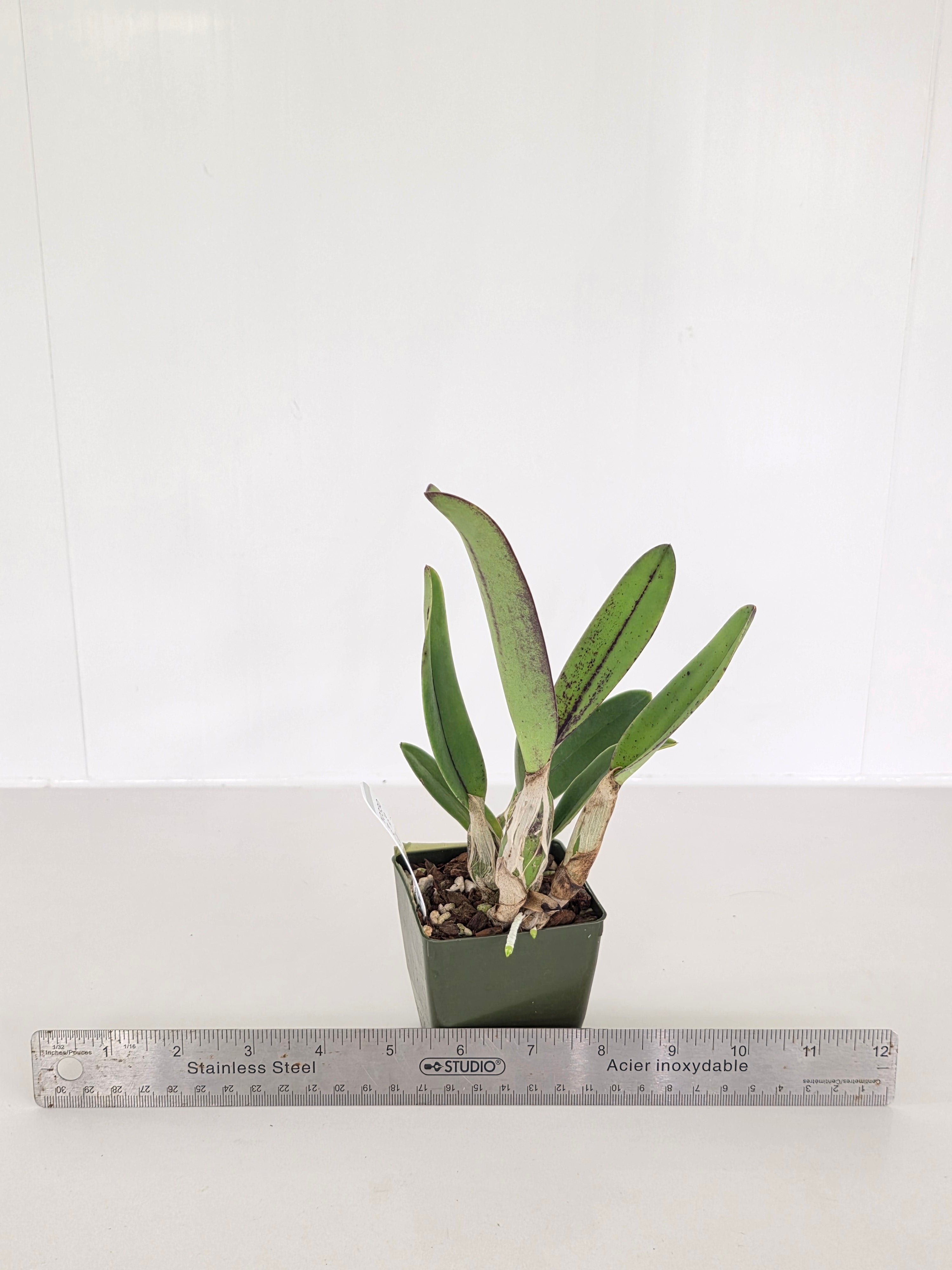 Jane Pierce (Pot. Martha Clarke x Slc. Precious Katie) produced 4-5, beautifully shaped, well-presented flowers with a unique flower color. Virginia Dickey (Slc. Pink Doll x Sl. Pole-Star) is quickly becoming a notable breeder of mini-Catts. It flowers twice a year in 3” pots and has sturdy stems holding 2-4 bright red flowers of superior form. This cross is an example of how we are reinventing mini-Cattleya breeding. This new hybrid will deliver flat flowers with wide, rounded petals in amazing, intense colors on miniature plants standing barely 6” tall, flowering in 3” pots and best yet 3-5 flowers per stem!