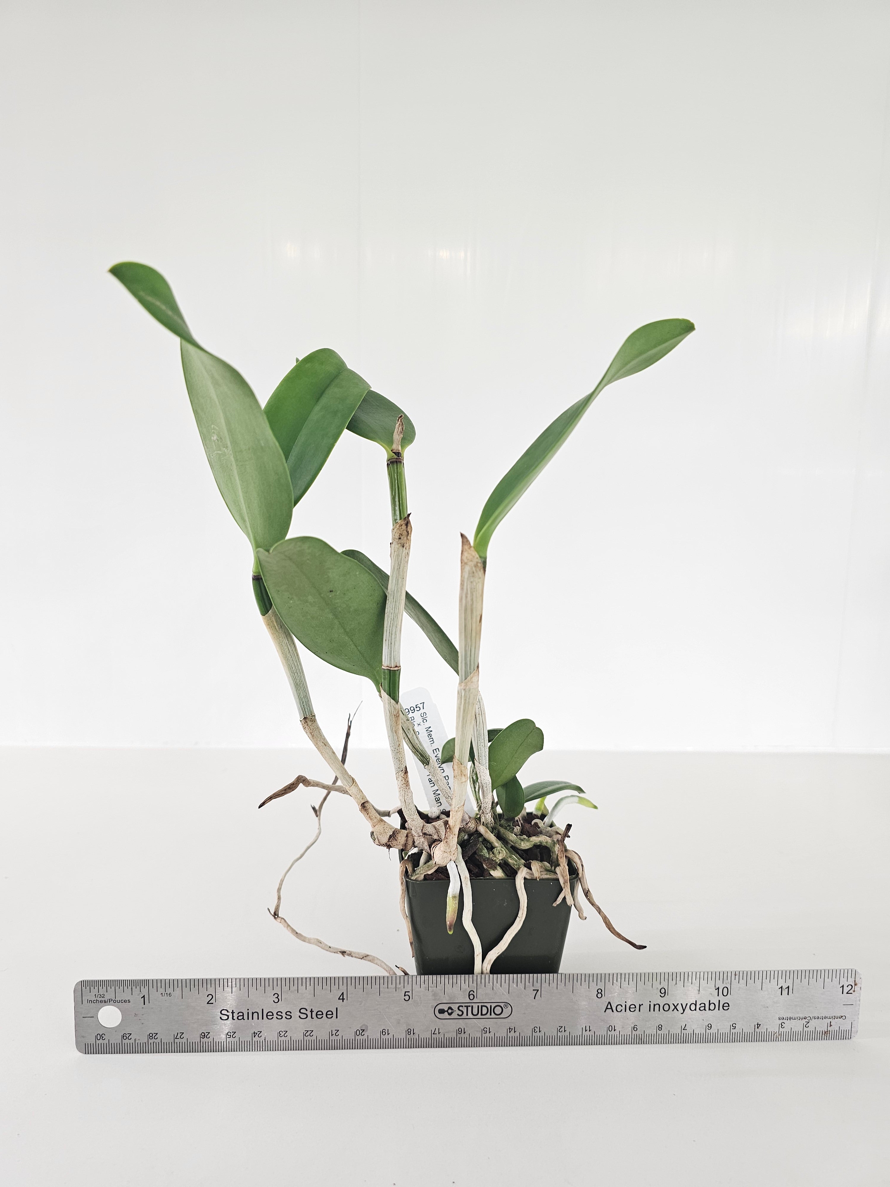 Memoria Evelyn Paquette (Slc. Armonía de Sueños x C. Mark Jones) has waxy yellow flowers with red spotting and nearly flat fuchsia lips with 4-5 well presented blooms. Sun Spots (C. Mark Jones x Blc. SunCoast Sunspots) blooms with the most flowers of the grex - the sturdy stem displays 8 to 9 flowers, above the foliage. Flowers are randomly spotted in red with a spade-shaped red lip. Yellow flowers with red spots are very collectable, and this pairing aims to produce these colors and increase flower count to 6-8 per stem. A great choice!
