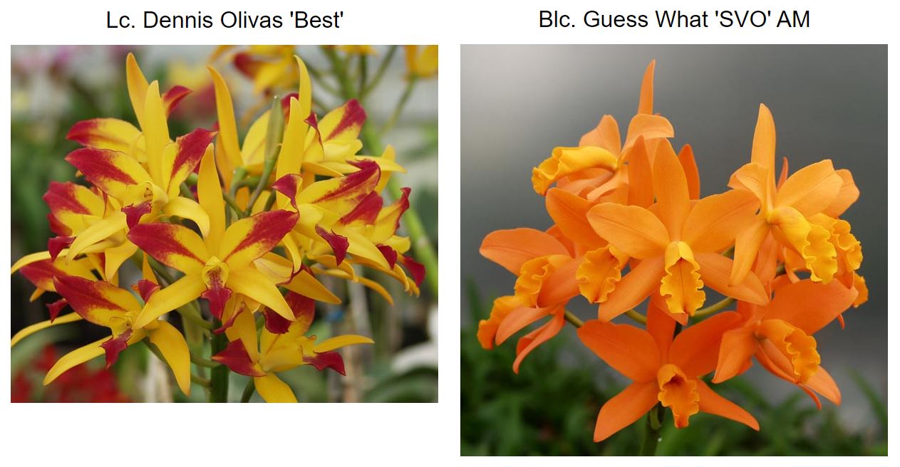 The big clusters of star-shaped flowers produced by Dennis Olivas (Trick or Treat x Penny Kuroda) are spectacular! Their yellow blooms with red flares really command attention. Guess What (Blc. Waikiki Gold x Lc. Trick or Treat) has vibrant orange-yellow flowers in clusters of 8-9 on strong stems. It’s a favorite breeder of mine. These parents will reinforce stem strength, flower count, and golden yellow color, with the Dennis Olivas contributing some of its red flaring. With Trick or Treat on both sides of this cross you can expect big heads of blooms!