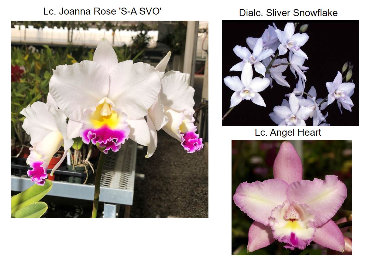 I wish I had a picture of Silver Heart (Dialc. Silver Snowflake x Lc. Angel Heart). The flowers are a light cream with a touch of flaring in the petals. Strong stems hold 5-7 well arranged blooms. This cultivar of Joanna Rose (Lc. Melody Fair x Lc. Liptonii) is beyond outstanding, with unbelievably nice shape, large flowers, sturdy stems, and attractive semi-alba coloration. I am expecting 4-5 large classically-shaped flowers held well above the foliage on strong stems.