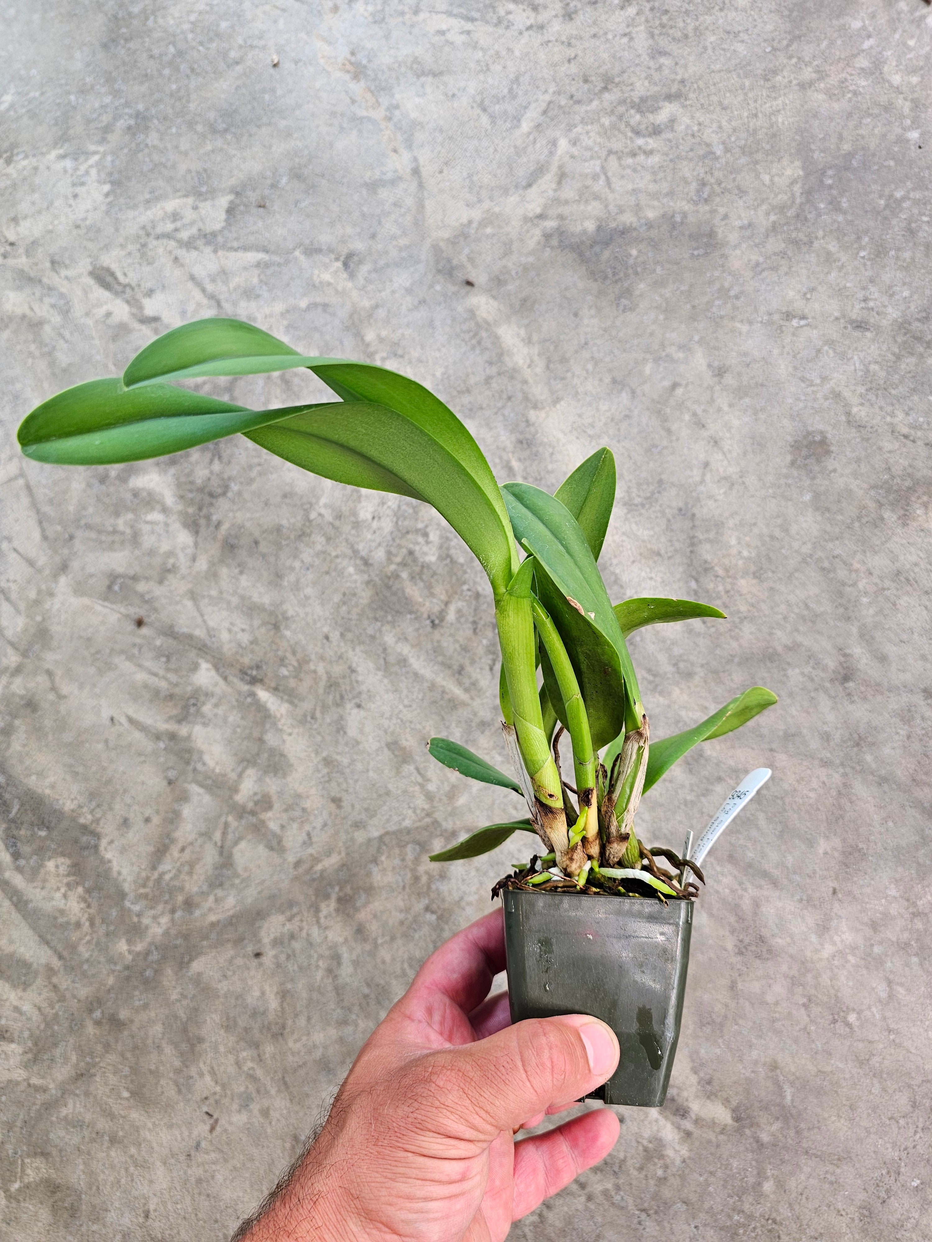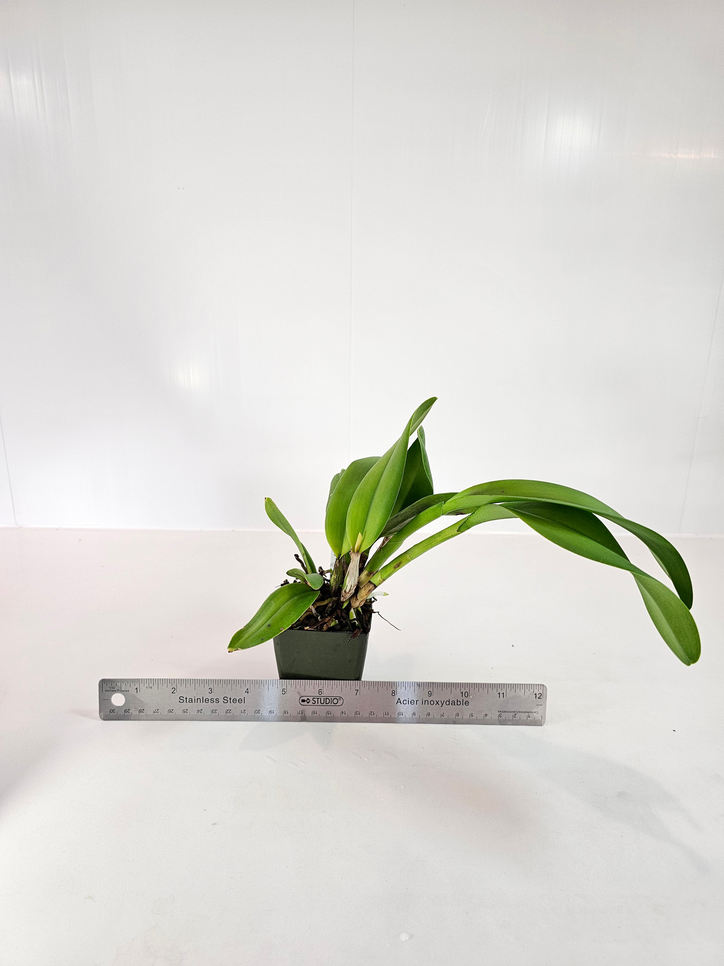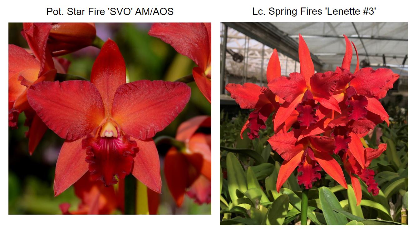 Star Fire (Lc. Trick or Treat x Pot. Rubescence) 'Ruben’s Red' produces 7 well-presented flowers in solid, saturated red, and the ruffled red lip becomes darker red centrally. Spring Fires (Lc. Fires of Spring x Lc. Fire Island) has strong upright stems carrying 5-9 red-orange flowers with darker red lips. It is proving to be an excellent parent, with dominance for color, strong stems and bloom period. This promising grex is continuing a series of steps aimed at developing the perfect head of intensely-colored deep-red flowers held high on sturdy stems. We also have this in the reciprocal as SVO 9382, providing a good opportunity to evaluate the influence of capsule vs. pollen parent.