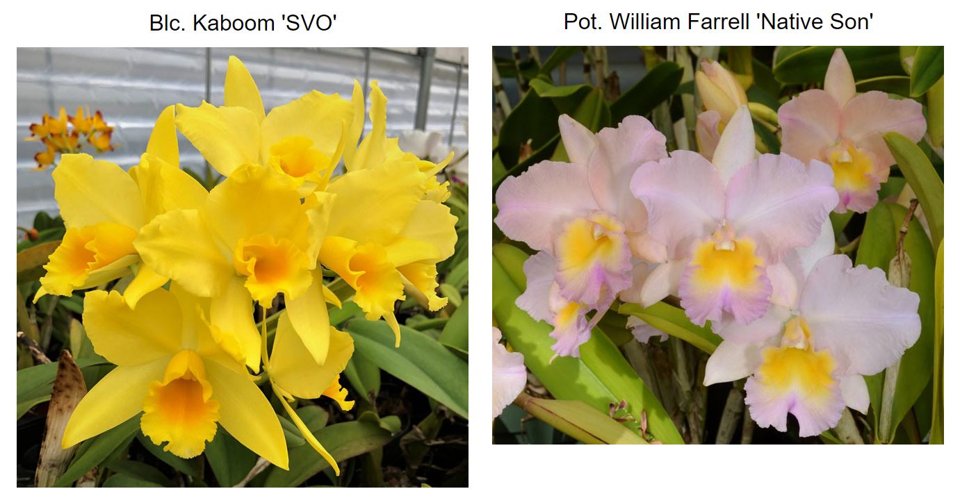 Kaboom (Blc. Guess What x Blc. Schroder's Love) is a great plant with a compact growth habit and strong upright inflorescences carrying 6-7 large, well-arranged, bright yellow flowers. It’s combined here with William Farrell (Slc. Helen Veliz x Bc. Llano) 'Native Son', which carries 5-6 beautiful, well-arranged, soft-peach-colored flowers on strong stems above the foliage. The offspring will be impressive, with 5-7 well-arranged flowers of excellent form on strong stems. Soft pastel colors will prevail. A very high potential cross.  The reciprocal is also available as SVO 9258.
