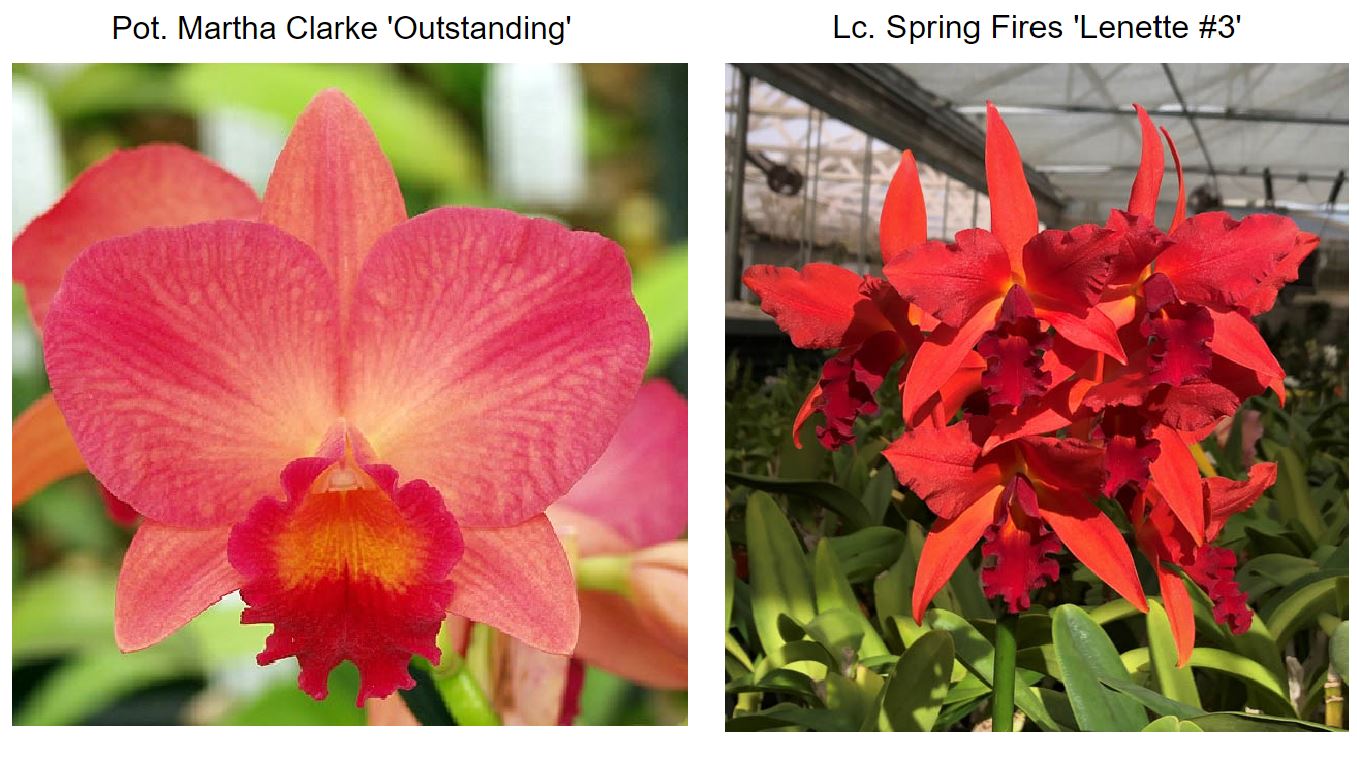 The combination of Slc. Circle of Life x Blc. Love Sound makes Martha Clarke, my wife’s namesake. These have great flower color and shape, a desirable growth habit, and are easy bloomers. Spring Fires (Lc. Fires of Spring x Lc. Fire Island) has strong upright stems carrying 5-9 red/orange flowers with darker-red lips. It is proving to be an excellent parent with dominance for color, strong stems and bloom period. It is hard to improve on each of these parents, but this might just be the combination that incorporates the best of both. These should have great stems holding 5-7 flowers above the foliage. Flower colors will range from solid red to medium-red brushed with red flares, and all will have dark-red lips.