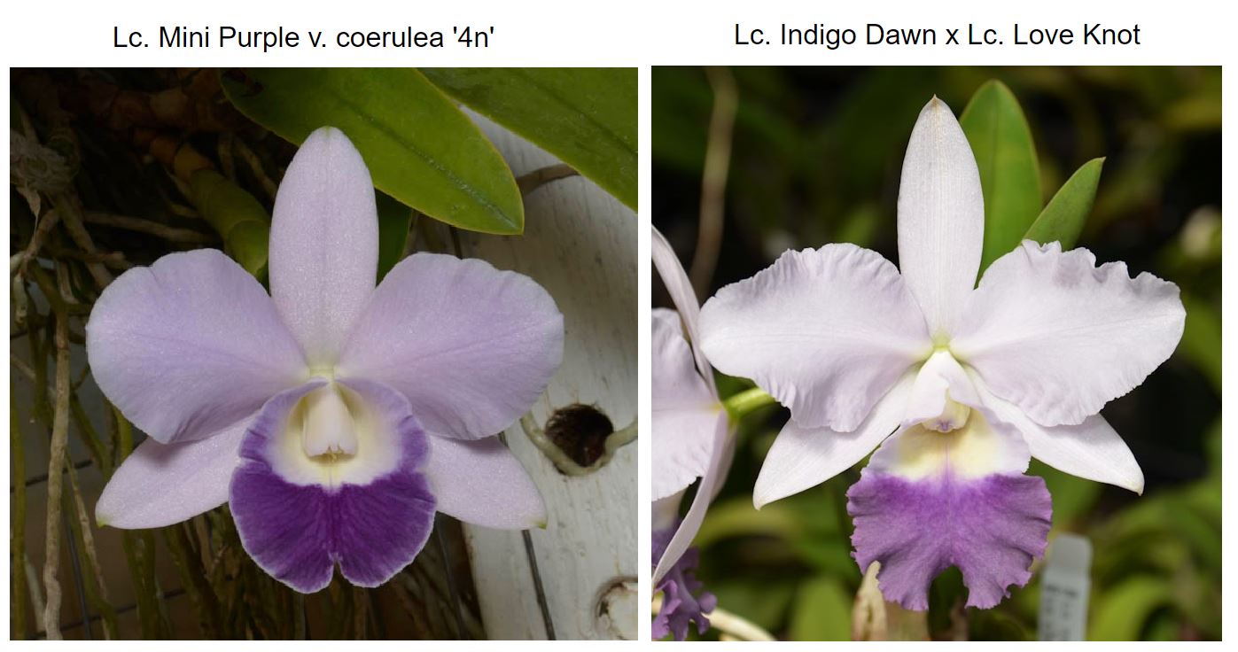 Mini Purple (L. pumila x C. walkeriana) coerulea has been an influential parent in breeding blue mini-Catts. The cultivar ‘H&R’ is a meristem mutation found in a population of clones in Japan. Lc. Indigo Love (Indigo Dawn x Love Knot) is a modern blue hybrid with compact plant size and large flowers influenced by the C. warneri and C. warscewiczii in its ancestry. This cross will give us large flower size on small plants. All the flowers will be in shades of coerulea with darker blue lips.