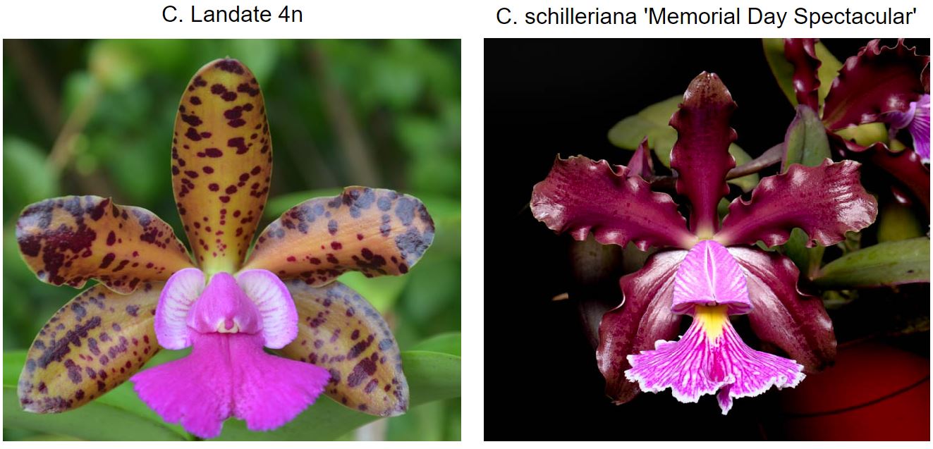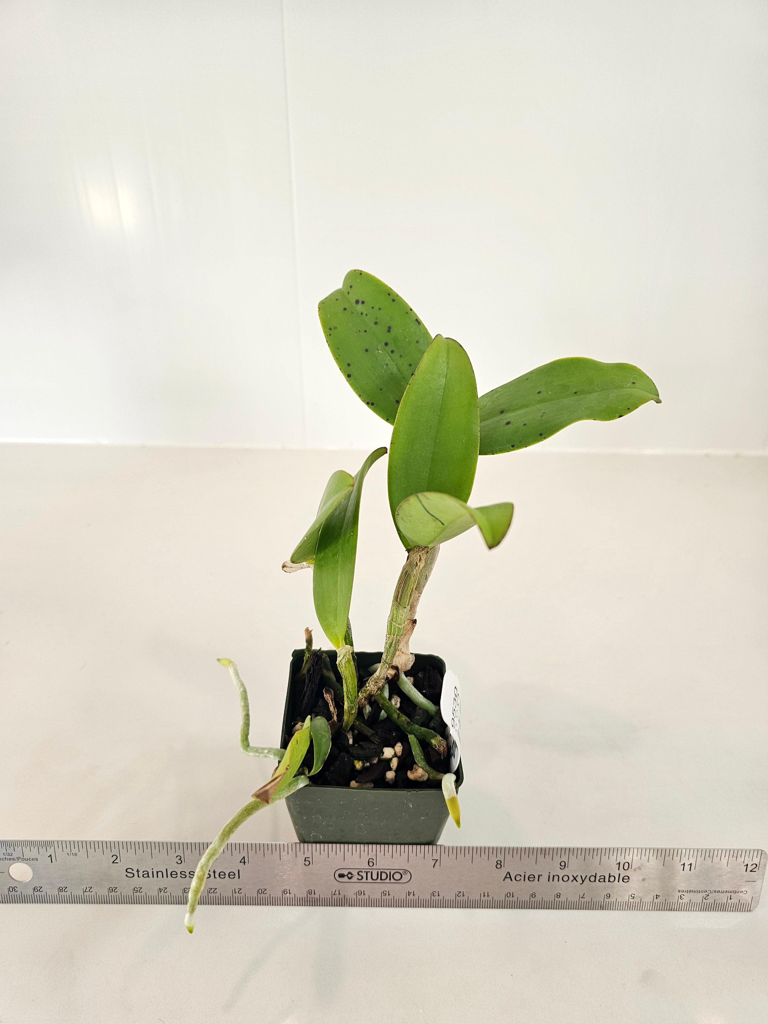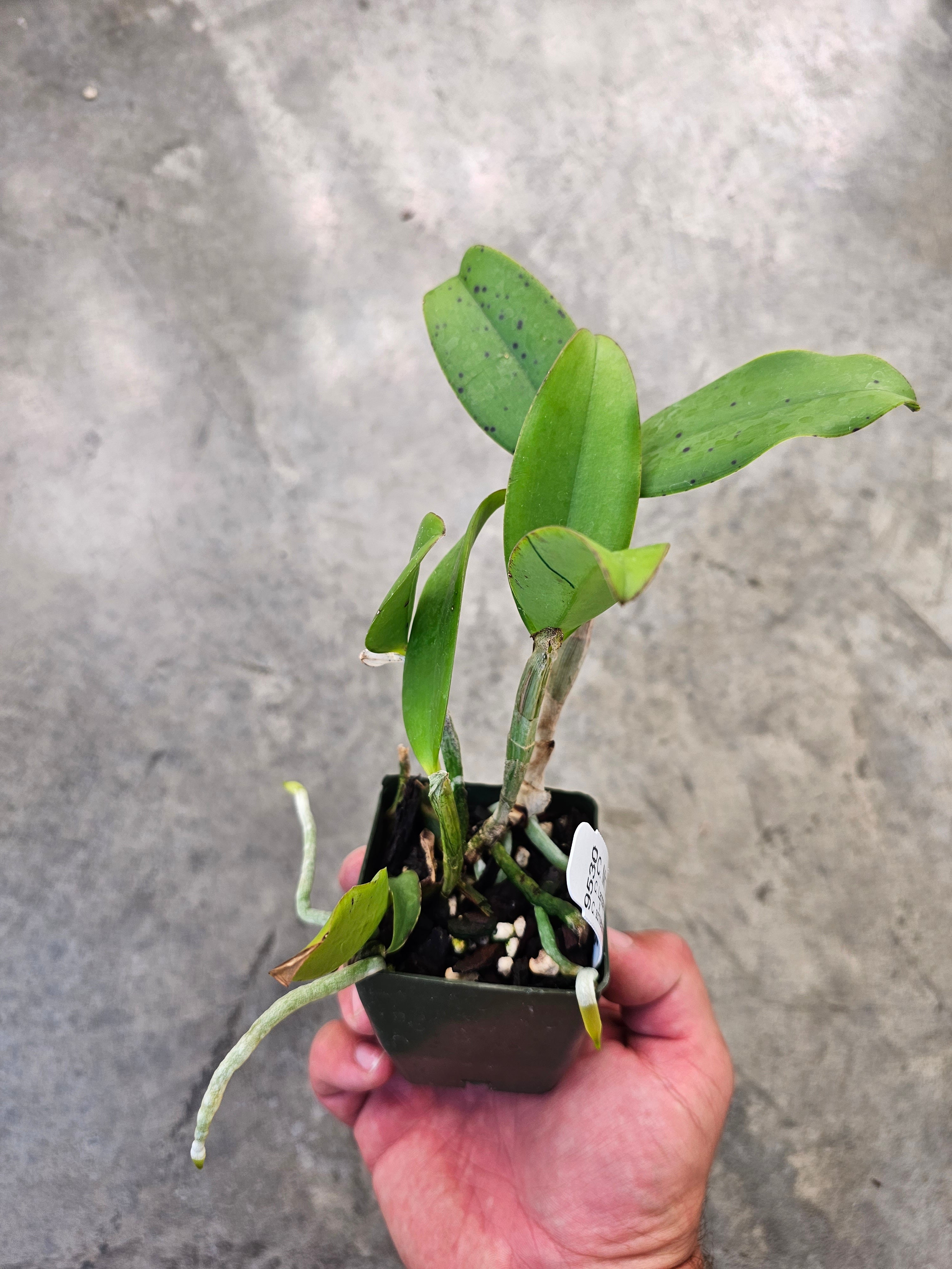 C. Landate (C. leopoldii x C. aclandiae) looks like a floriferous C. aclandiae with 4-6 very showy, fragrant flowers. The 'SVO' cultivar was a gift and came from the breeding program of Roy Tokunaga. This schilleriana has the appearance of a tetraploid but hasn't been confirmed. Its flowers are exceptionally large and have surprisingly hard substance. With these three bifoliate species (aclandiae, leopoldii, schilleriana), we can be assured that the flowers will be a dark chestnut brown with darker spotting and a broad intense magenta lip, plus a spicy fragrance. These are going to look like super improved schillerianas! Here's your chance to get something great!
