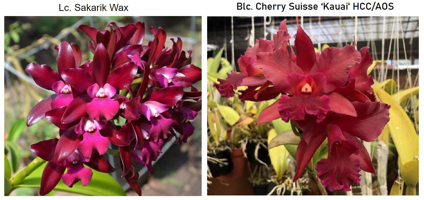 Waxy red clusters of fragrant flowers will result from pairing Sagarik Wax (Lc. Summerland Girl x C. Chocolate Drop) with Cherry Suisse (Blc. Oconee x C. Chocolate Drop). Both parents have eye-catching waxy flower substance and big heads of striking red flowers. This cross will produce impressive shows of flowers in late summer.
