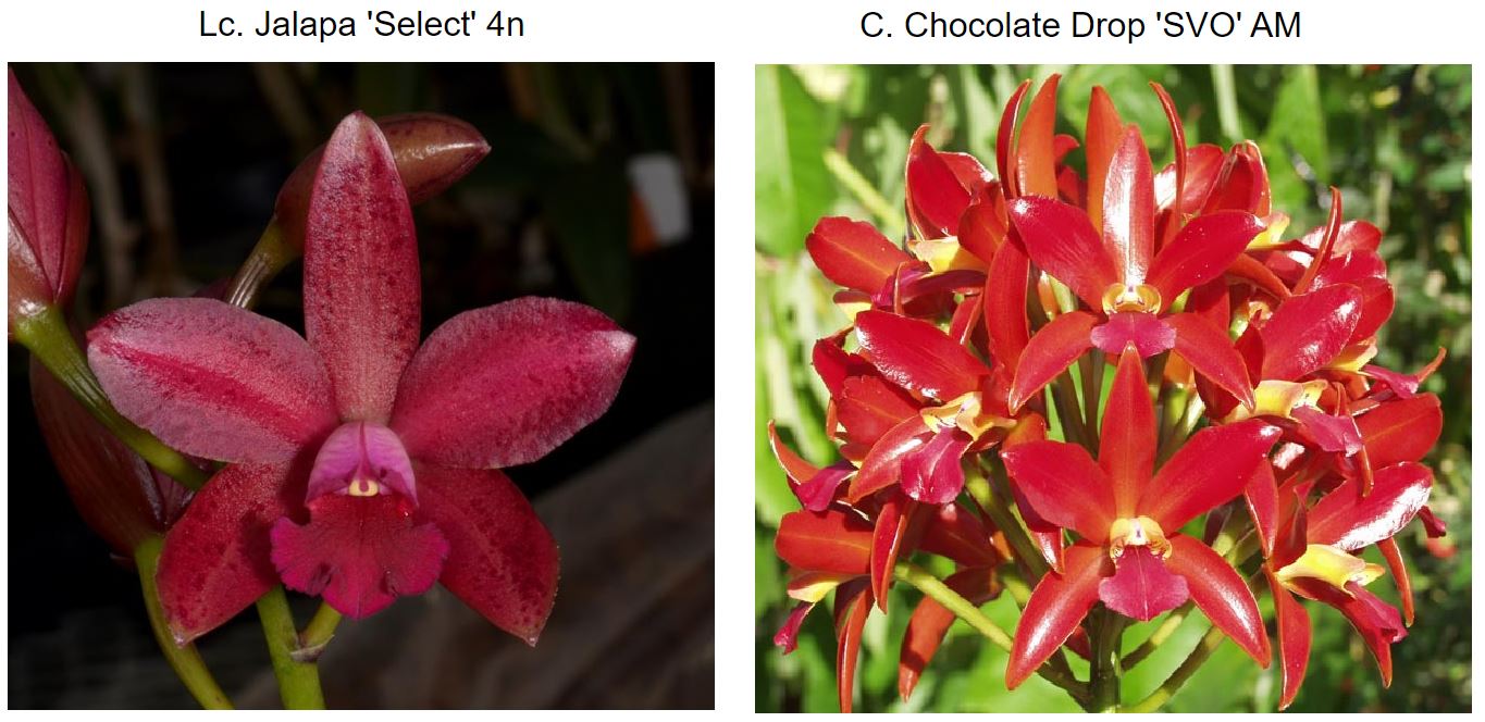 The quality of this tetraploid Jalapa (C. leopoldii x L. milleri) is amazing! The red flowers have dark burgundy spots and red lips and are held on strong, upright stems. This Chocolate Drop (C. leopoldii x C. aurantiaca) is also a 4n, and the progeny of this grex will be 4n well. The offspring will produce high flower counts on tall plants. Blooms will have a waxy texture and come in solid burgundy colors, with many exhibiting darker burgundy spots. Flowers will be well-arranged, making a spectacular display in summer.