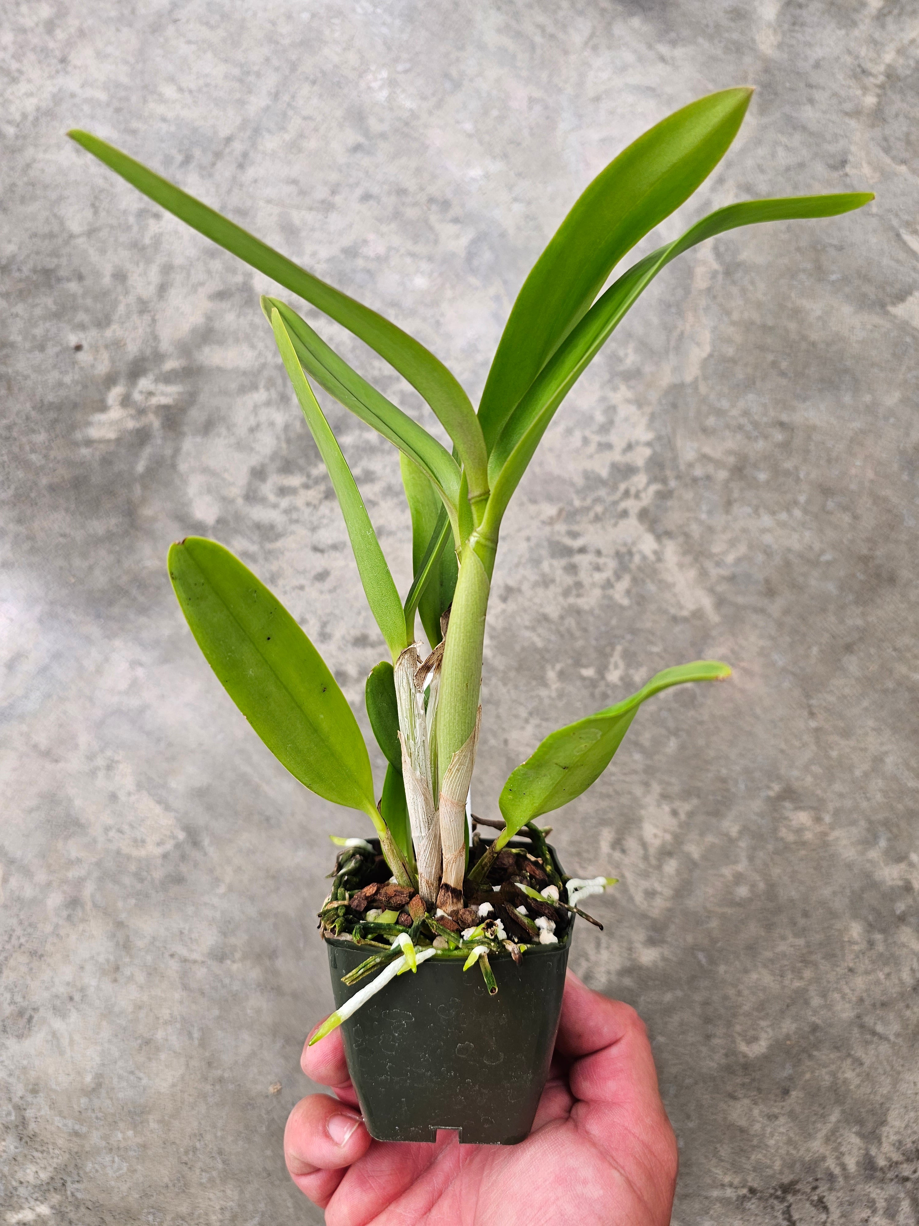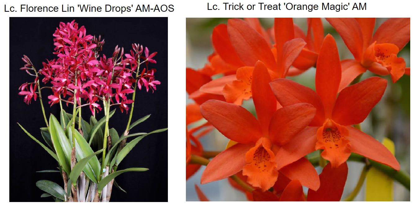 Florence Lin (C. tigrina x L. milleri) has upright straight inflorescences with starry dark red flowers and darker crimson-red lips.  When this cultivar was awarded, it carried 150 flowers on 9 inflorescences, an average of 17 flowers per inflorescence. Amazingly, the plant was growing in a 5” pot!  Trick or Treat (L. Icarus x Lc. Chit Chat) has a long history in breeding here at SVO. It’s a great grower and produces impressive heads of 15 or more starry orange flowers. The offspring will produce high flower counts of 15 or more starry red-orange-colored flowers held well above the foliage. These are vigorous growers and will make excellent specimen plants.