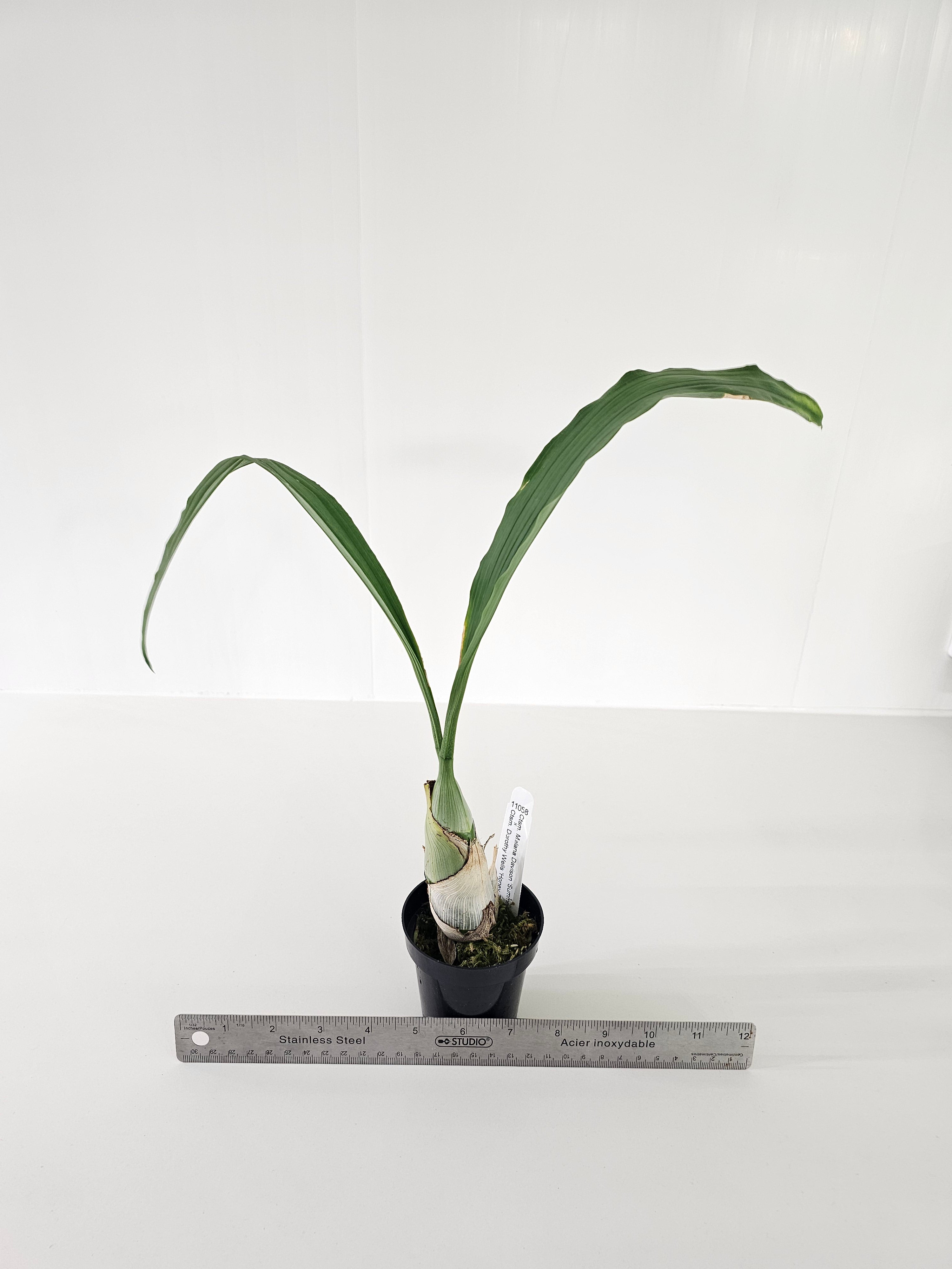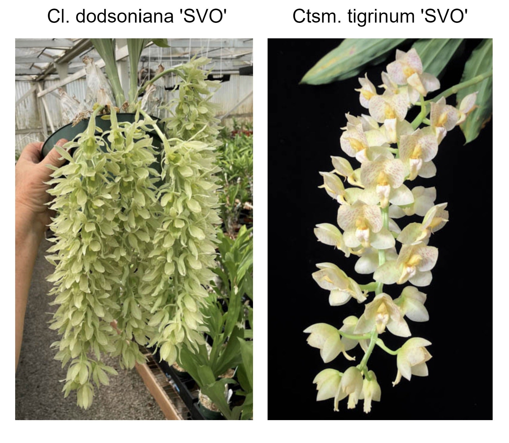 The species Clowesia dodsoniana has produced only 6 registered hybrids to date, but these have won a surprisingly large number of awards. We thought we should get into the action with some hybrids too. Cl. dodsoniana 'SVO' flowers in July with each bulb producing 2-3 cascading inflorescences of 60-70 flowers in light green with darker green stripes. Ctsm. tigrinum is a very special species: it is small-growing and flowers several times a year with cascading inflorescences that each hold 20-30 white-cream blooms spotted lightly in red on the petals and sepals. Equally important are the shape and placement of its wide petals, which fill the space between the dorsal and lateral sepals, creating a full-shaped flower. This is a great characteristic, which is transmitted to its offspring, making for beautifully shaped flowers that are valuable in hybridizing and exhibiting. This mini-Clowesetum will flower at 4-6” tall and bear cascading inflorescences of 30 or more nicely shaped white flowers with light pink spotting. The long-lived flowers will be produced multiple times in both fall and winter. This promises to be a very charming hybrid!