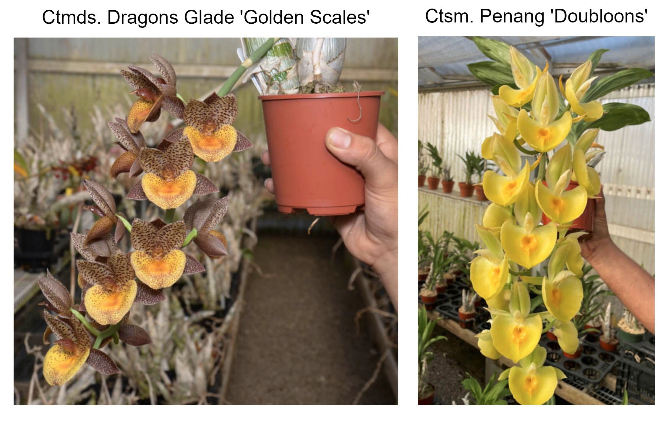 This cross has the potential to produce yellow flower colors, a rarity for Catamodes hybrids and a new breeding direction. This cultivar of Dragons Glade (Ctmds. Dragons Tail x Ctsm. Orchidglade) has excellent flowers with a predominantly yellow base color overlaid with red spotting. Penang (Ctsm. Susan Fuchs x Ctsm. pileatum) is responsible for producing some very successful hybrids. The cultivar 'Doubloons' flowers with more than 20 large, yellow flowers with nearly perfect arrangement, and it does so several times a season. In this cross, the use of Penang will increase flower size and shape, in addition to reinforcing the yellow color. The flower count will be 20+, plants will bloom 2-3 times a season, and flower longevity will approach 5 weeks! If you love Catasetinae hybrids as much as I do, this cross will set a new standard of quality in your collection.