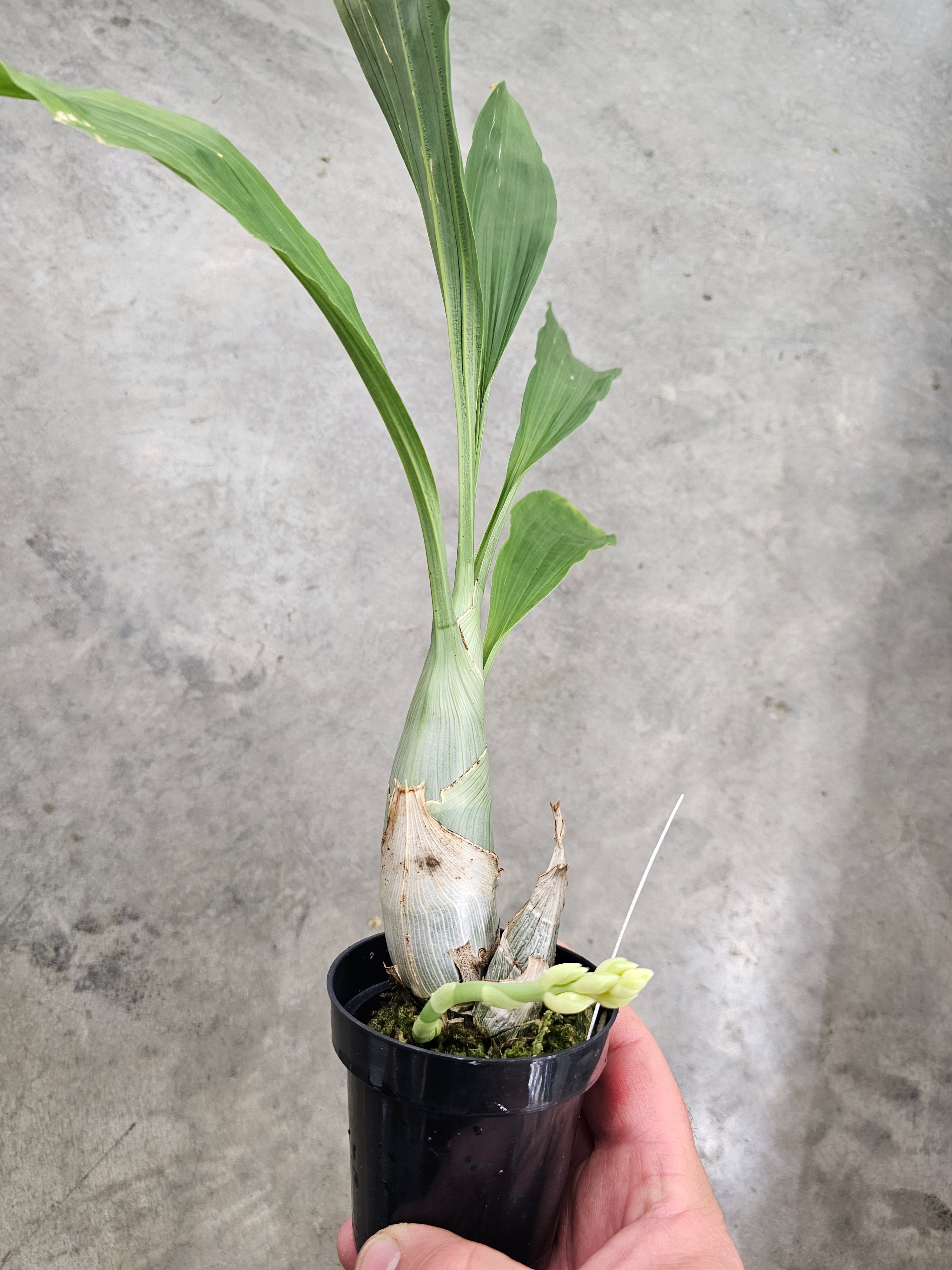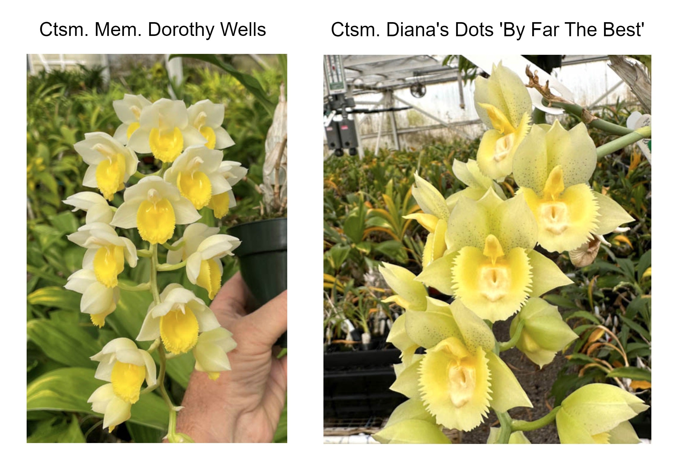Mem. Dorothy Wells (Ctsm. Dentigrianum x Ctsm. Chuck Taylor) 'Silver & Gold' has exceptional, pure white flowers with bright yellow lips. Really awesome! This Diana's Dots (Ctsm. tigrinum x Ctsm. Orchidglade) is named 'The Best So Far' for good reason. It has excellent flower size, shape, and color. The white and yellow color combination is very unusual, and developing it further is cutting edge breeding. Here we are hoping to see flower size and shape improve while keeping this desirable color combination. Plants will be fast to develop and flower 2-3 times a season once mature.