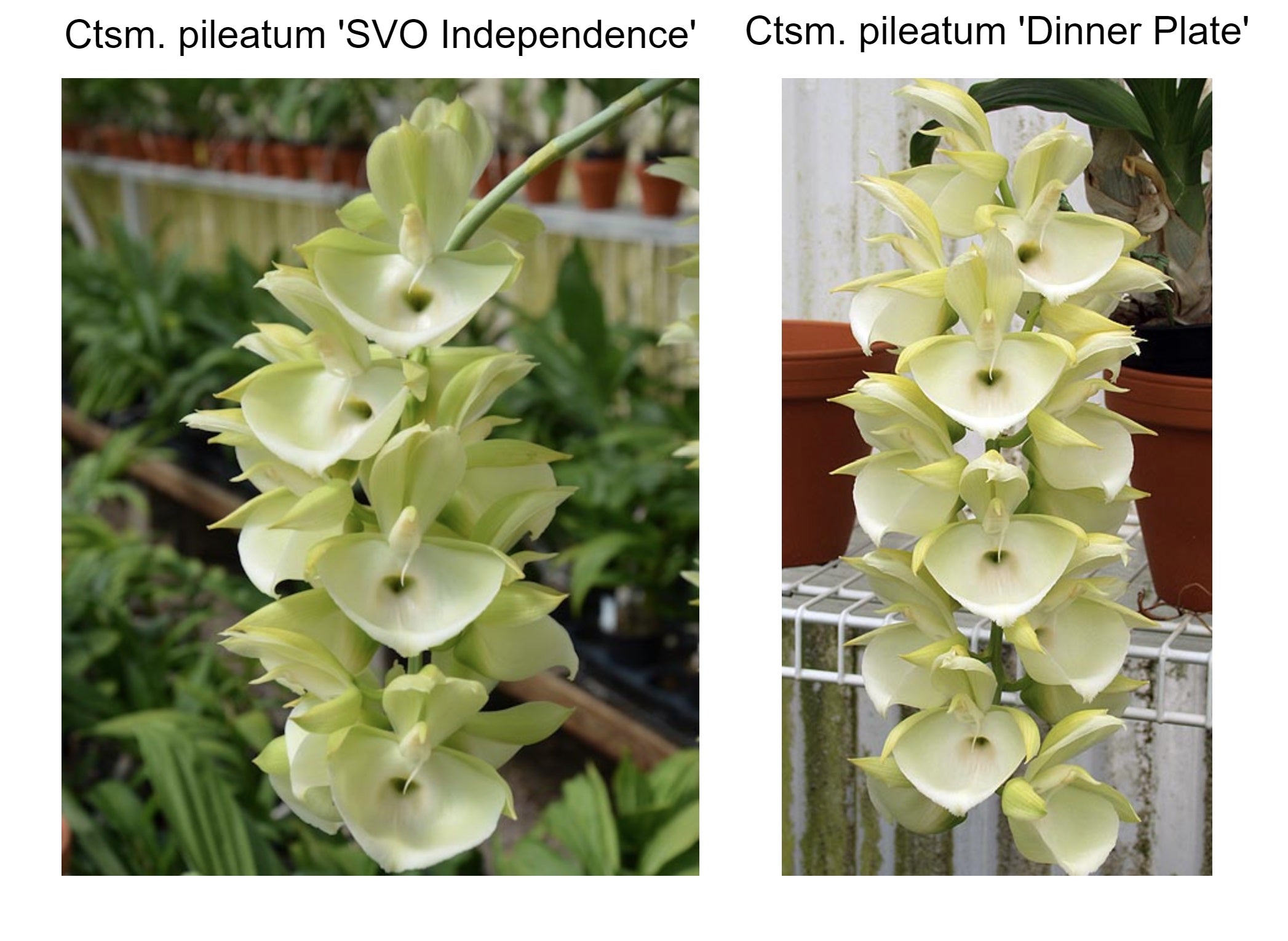 We were a bit surprised this year by all the female Ctsm. pileatum flowers! Excited by this unusual phenomenon, we made multiple outcrosses with different cultivars of this desirable species. Both of these varieties of pileatum have been in our collection for years. 'SVO Independence' blooms reliably on the 4th of July, and 'Dinner Plate' has an impressive lip. Both produce 13-15 flowers twice a year. It's hard to believe this is the first time we have been able to cross these two fine examples of pileatum.