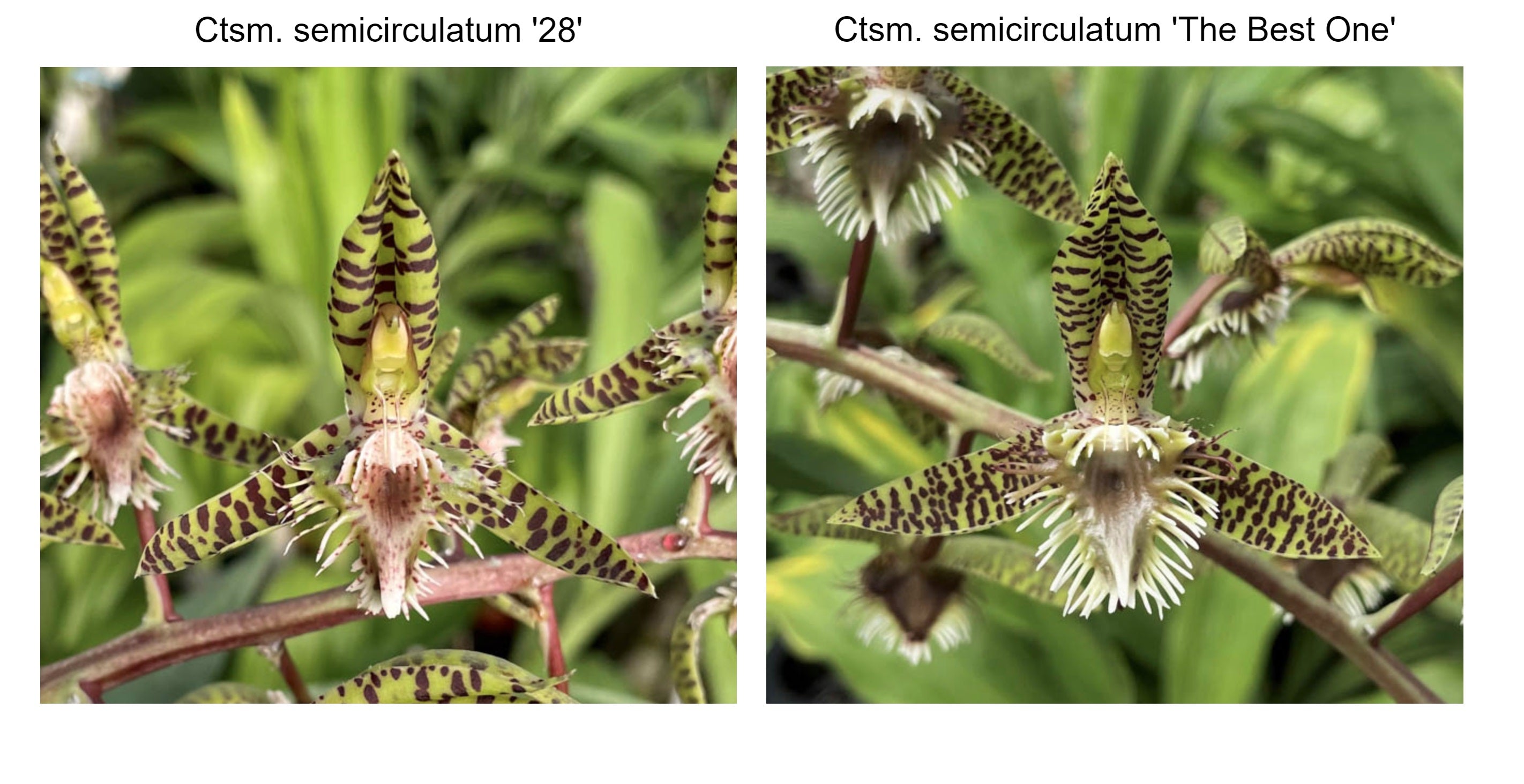 It has taken years to get simultaneous female and male flowers to make this pairing. Ctsm. semicirculatum '32' has 32 flowers, but when the photo was taken it had 28…on a single inflorescence. As the name implies, 'The Best One' has the best shaped flowers and 26 per inflorescence. This breeding is directed toward producing plants with exceptionally high flower count and excellent shape of a species that is very rare in cultivation.