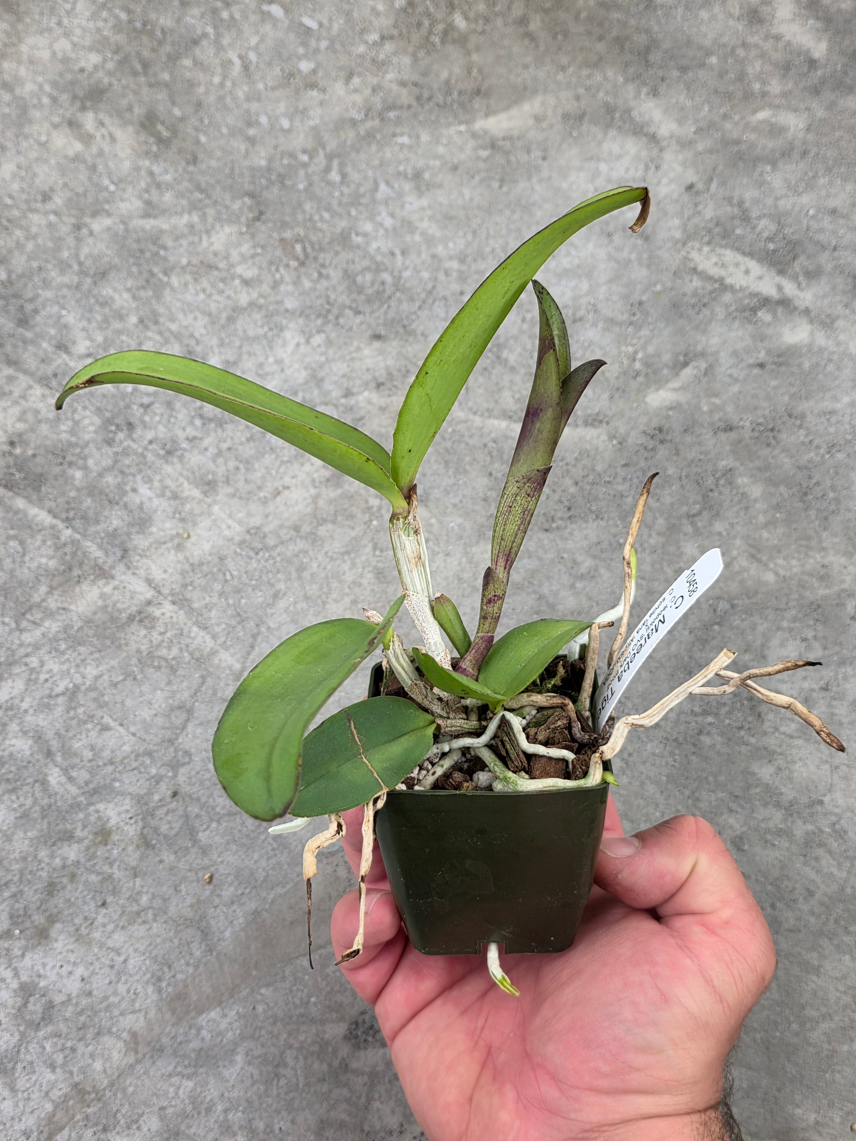 This is one of the great bifoliate hybrids. Flowers are huge, waxy, fragrant, and spotted with red lips and 12-17 flowers on a stem! This is our third offering of this cross, and plants from the first two releases received 13 AOS awards! That is an amazing result - the judges were obviously impressed. This is a top quality cross, get them while you can.