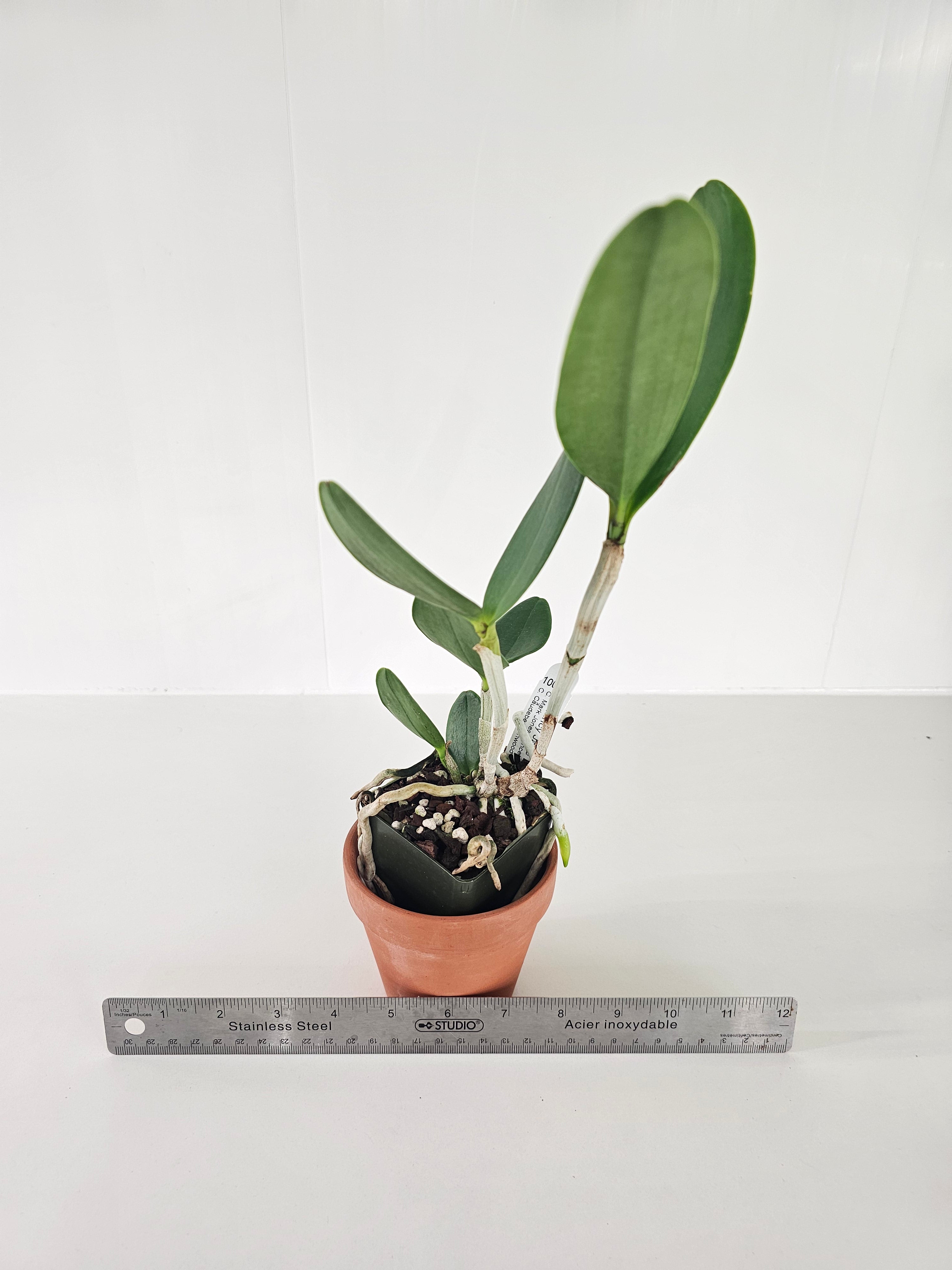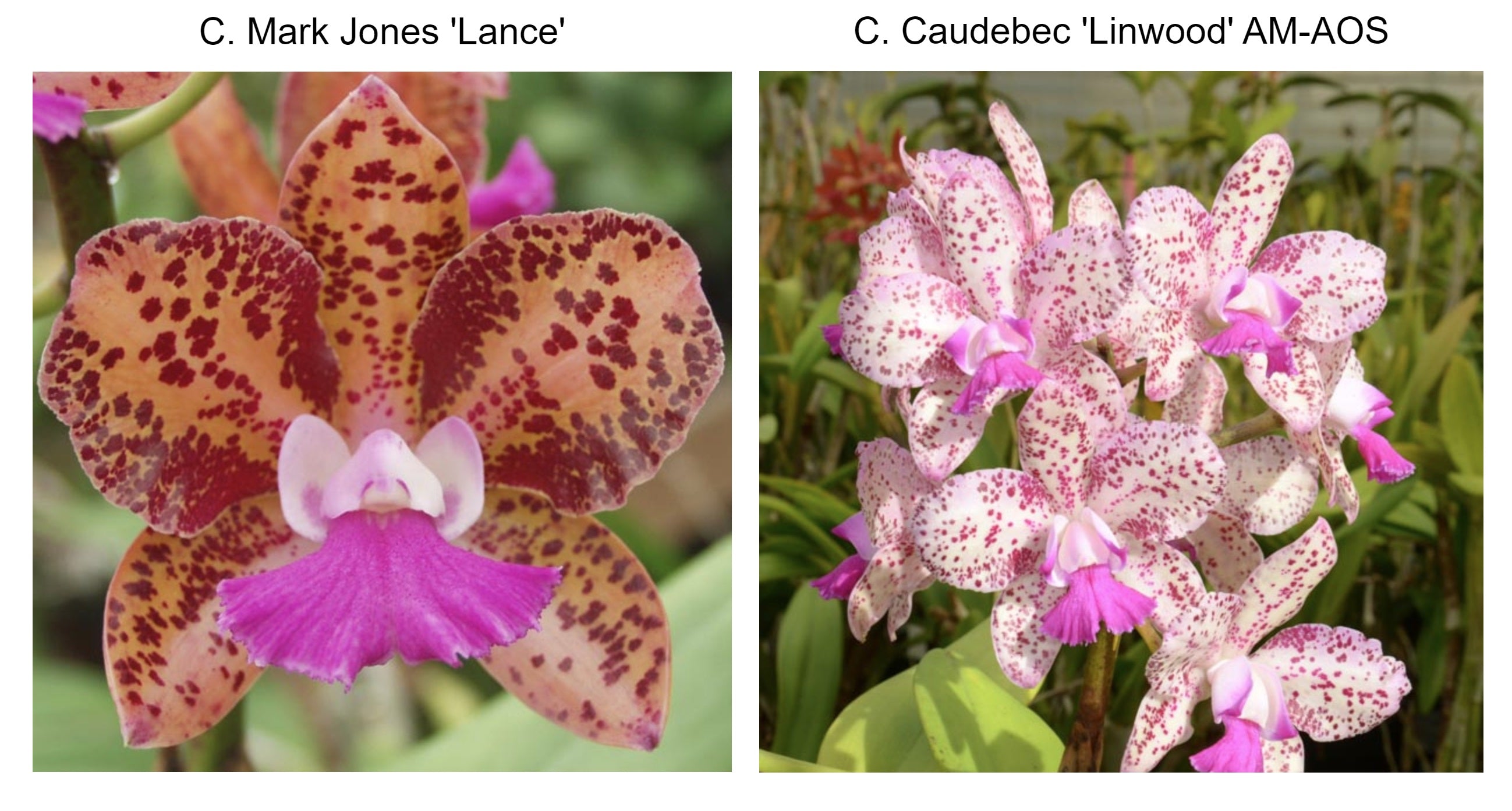 Caudebec (C. Sophia Martin x C. Penny Kuroda) 'Linwood' is a meristem mutation and superior to other cultivars. It blooms with large, light pink flower with dark pink spots a magenta lip, and the strong stems carry 9 flowers each.  Mark Jones (C. Caudebec x C. Fascelis) is a full shaped flower, carried 7-9 per stem, it has surprisingly wide petals an olive-green color, with dark amethyst spots and a broad red lip.  These are summer bloomer, a time when not many Cattleyas flower.  Plants will mature at 14-16” tall, have wider petals than most spotted hybrids, and produce 7-9 flowers per stem. A nice step forwards it breeding for full shaped wide spotted petals.