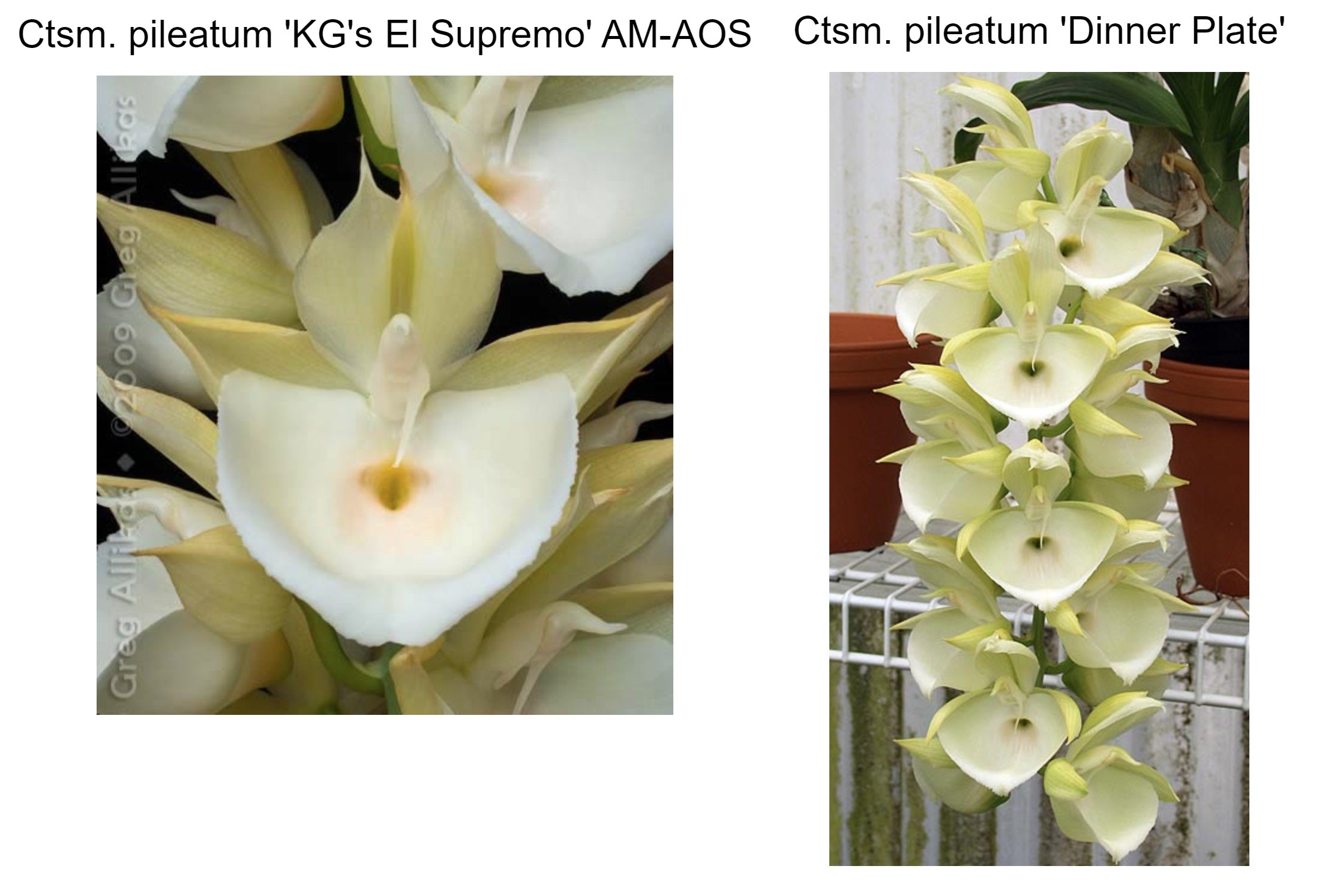 The parents used in the cross have the best quality flowers in our collection. We have waited for years to finally get female flowers on our plant of 'KG's El Supremo' so we could make this cross! Fortunately, we saved pollen from the prior year's flowering of 'Dinner Plate' and were prepared. This is going to be a top-quality batch of pileatums. Expect the flowers to have huge lips and 12-14 flowers per inflorescence in colors of ivory. Here is the provenance of 'KG's El Supremo' as described by the late Greg Allikas: “In 2002 I was in Caracas, Venezuela for the Sociedad De Orquideologia show. I bought three tiny seedlings of Ctsm. pileatum of a sib cross from Paya Orchids. They all bloomed out nicely and were similar. I named the best one 'El Supremo'. Only one of the original three has been shown, and 'El Supremo' got an AM/AOS at Florida-Caribbean judging in Aug 2009”.