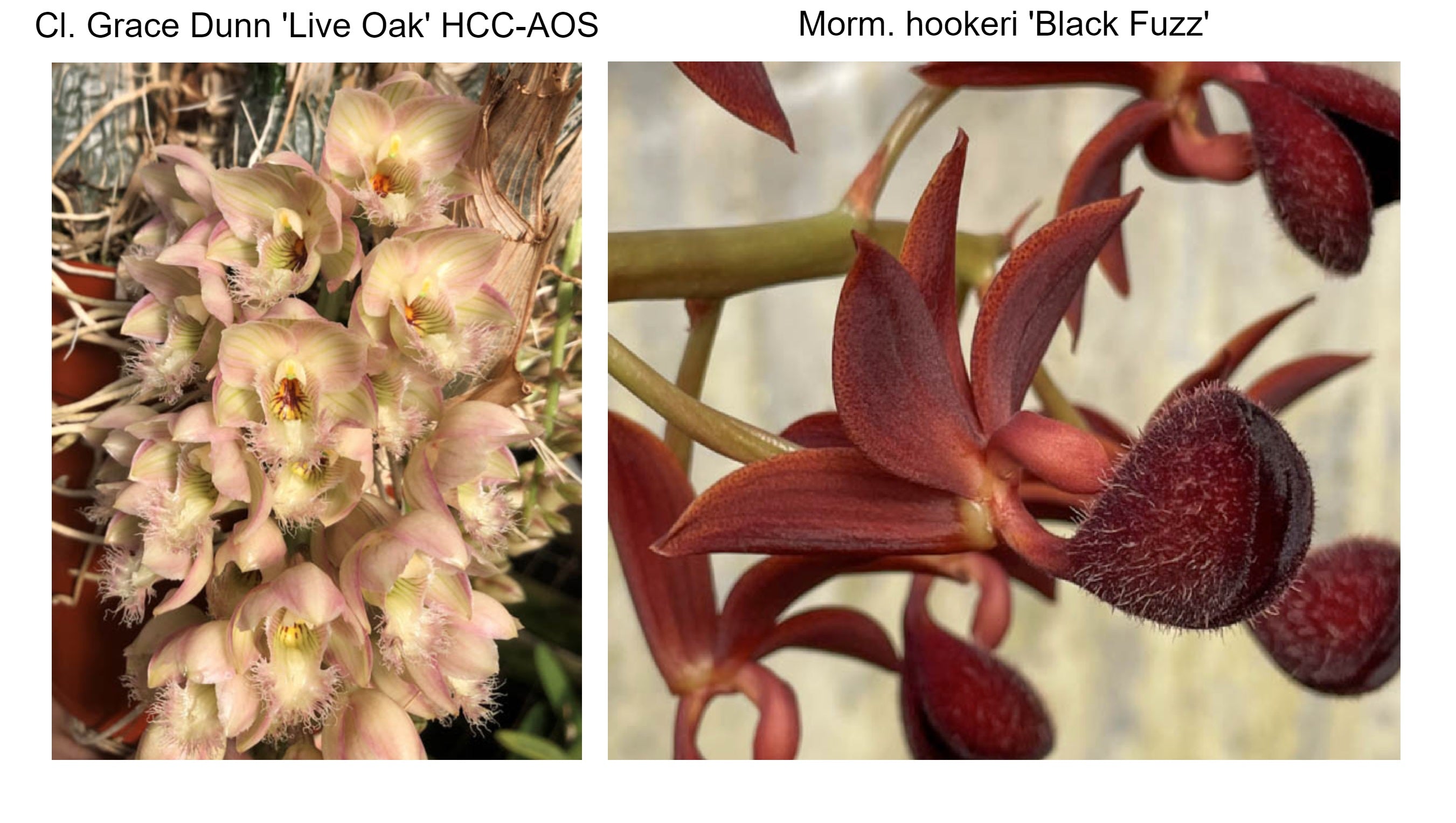 Cl. Grace Dunn 'Live Oak' HCC/AOS x Morm. hookeri 'Black Fuzz'