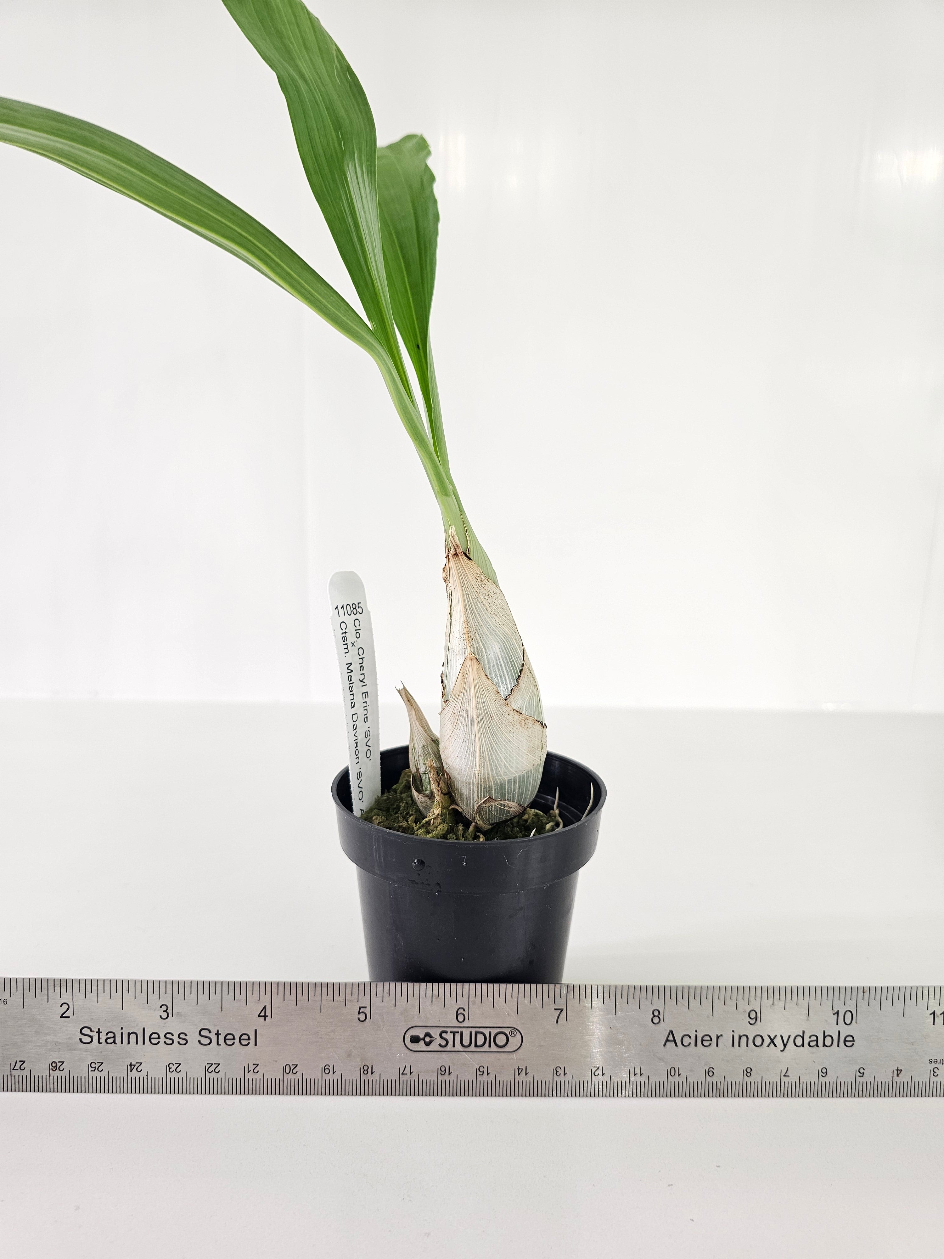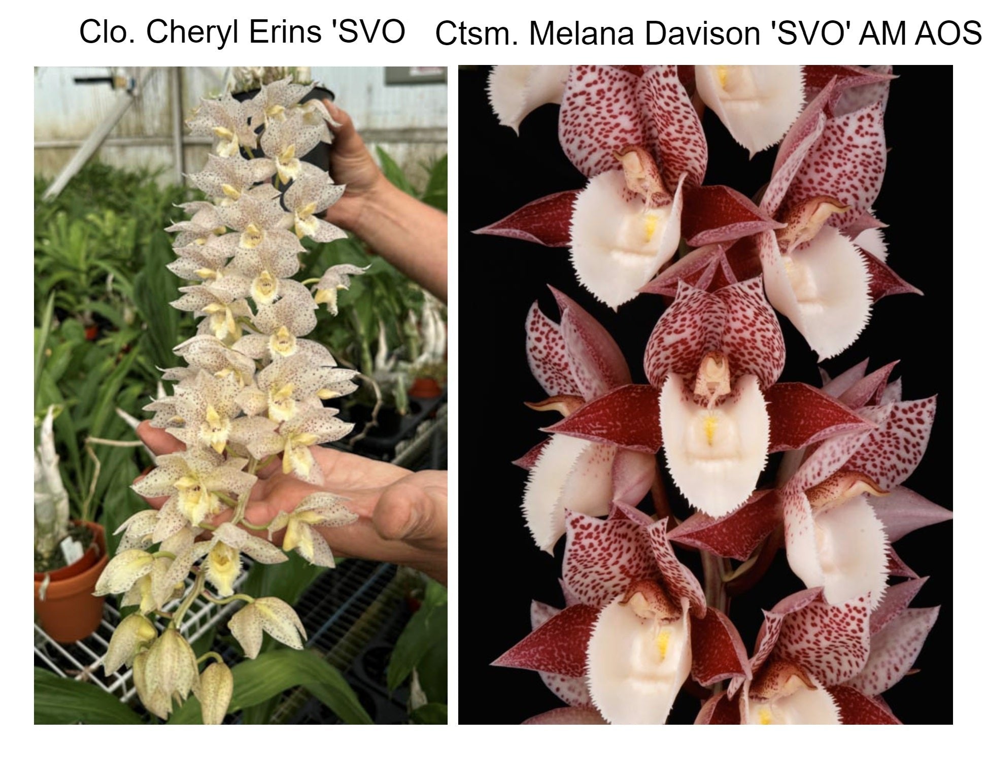 We are very happy with Clo. Cheryl Erins (Cl. russelliana x Ctsm. tigrinum): the flowers are pure white with dark pink speckling, and it is very, very floriferous, carrying over 30 flowers on each inflorescence!    Melana Davison (Ctsm. denticulatum x Ctsm. Penang) has been a successful mini-Catasetum hybrid with many outstanding cultivars. It is also a proven breeder. The cultivar 'SVO' has perfectly-arranged red spotted flowers with a pure white dentate lip, and the plants bloom 3-4 times a season! This combination is all about breeding for red spotted flowers and white lip color. But wait, there's more! Also expect 2-3 inflorescences per bulb with 20+ flowers each and a flower longevity of 3 weeks on a mini-Clowesetum plant! This is a very promising hybrid.