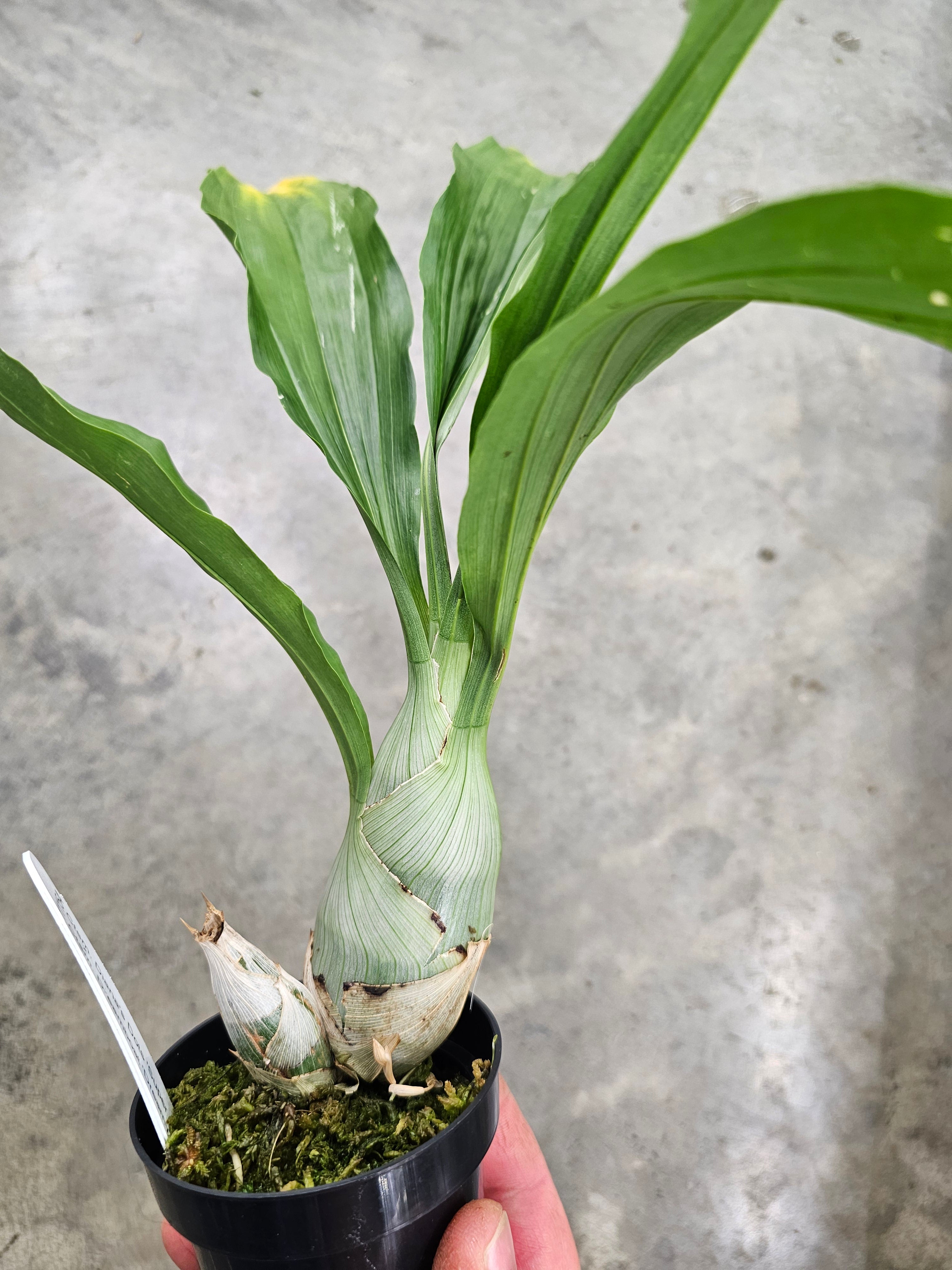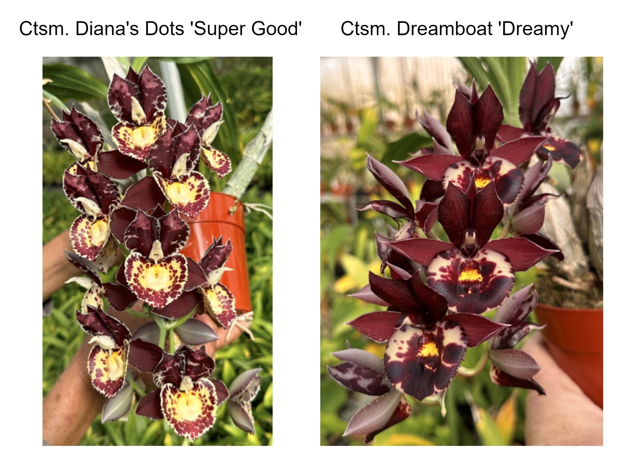 Diana's Dots (Ctsm. tigrinum x Ctsm. Orchidglade) is becoming one of our favorite breeders. The cultivar name 'Super Good' is very telling. Flowers have excellent color, size, shape, and count, and plants bloom multiple times each season. One of the reasons Diana's Dots has shapely flowers is due to the dominant flower shape from the species Ctsm. tigrinum. The flowers of Dreamboat (Ctsm. Penang x Ctsm. Chuck Taylor) are exceptional, with deep color and beautifully mottled full-shaped lips. The flowers from this cross will be rich burgundy and have large flat lips and broad segments, with 20 or more perfectly arranged flowers on arching inflorescences 2-3 times a season. This cross has all the ingredients to raise the level of quality in Catasetums.