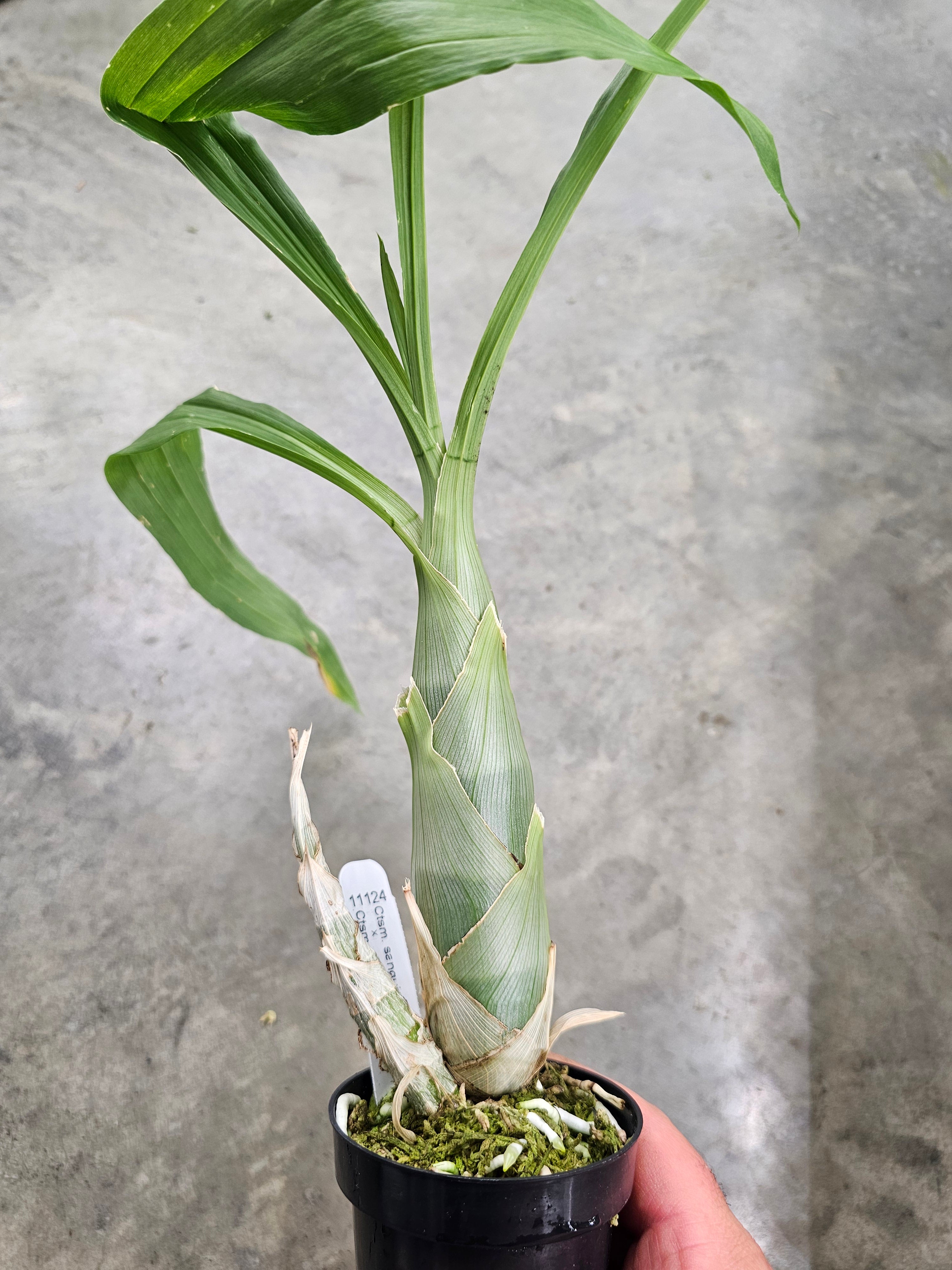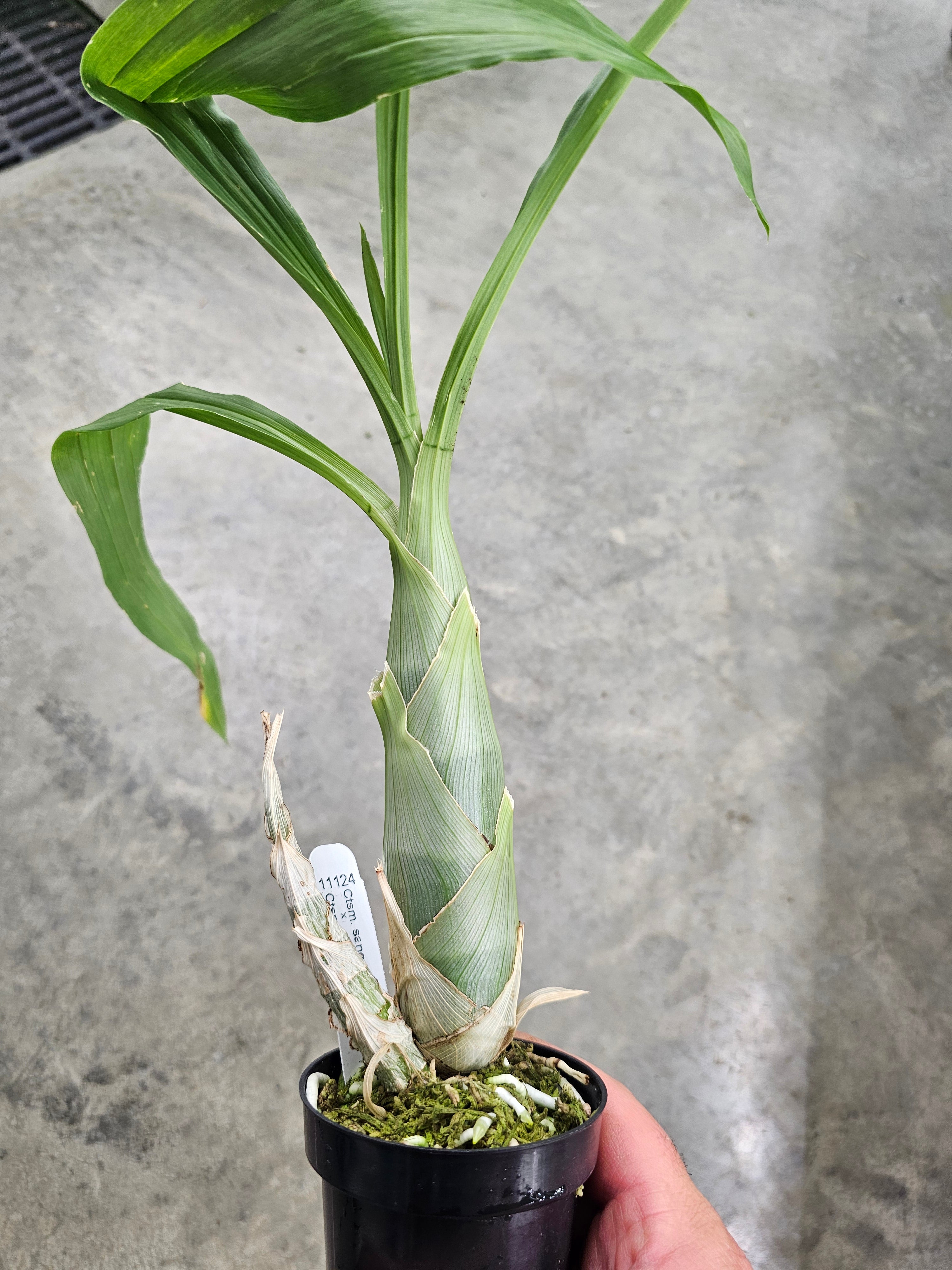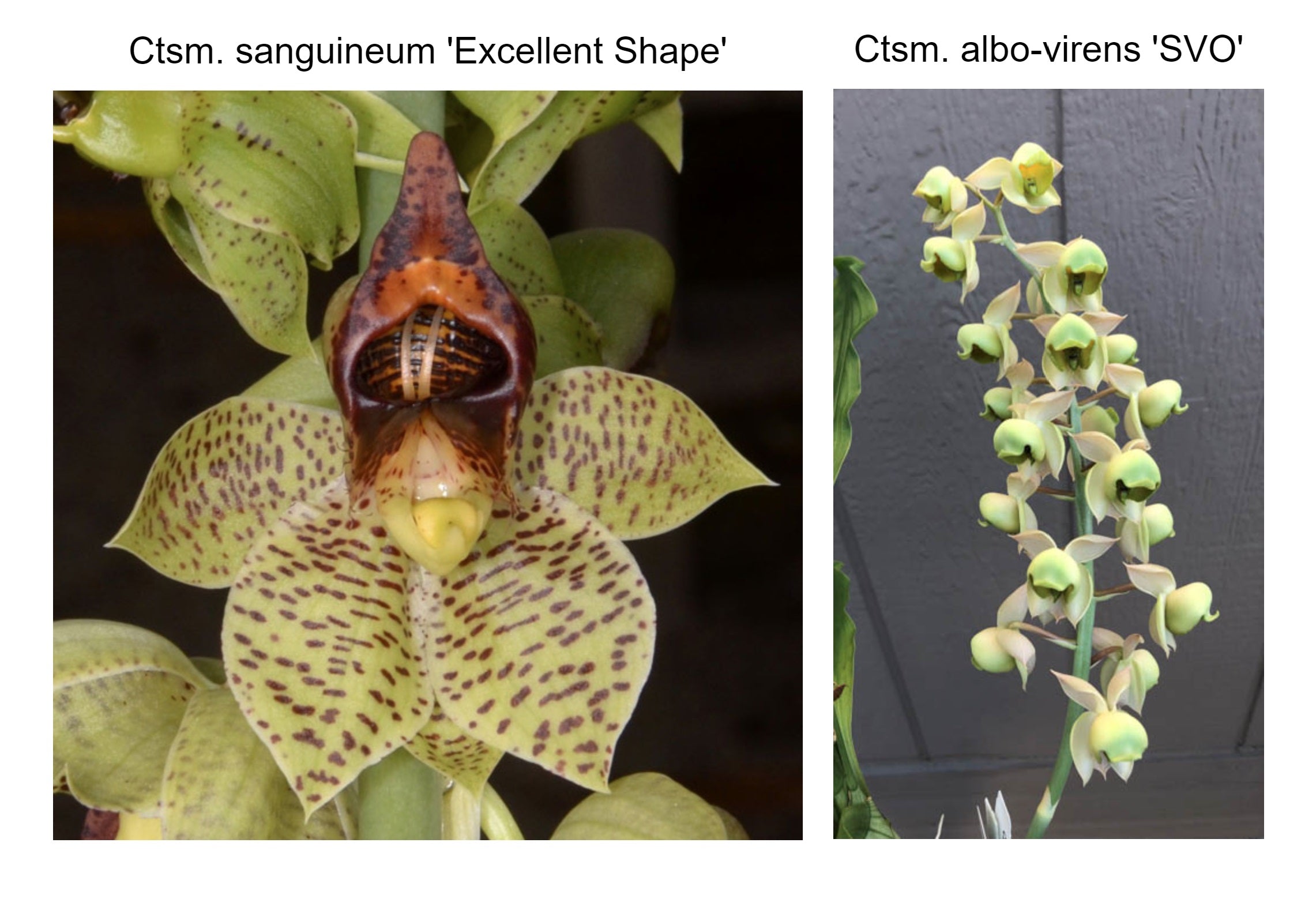 The name of Ctsm. sanguineum refers to the blood-like “sanguine” coloration of the flowers. This species produces straight, upright inflorescences with as many as 16 flowers, and the plants are sturdy, robust growers. Ctsm. albo-virens is a miniature Catasetum species with a straight upright flower stem! Can you envision where I am going with this cross?  How about a totally new type of breeding? These will be small plants with straight upright inflorescences of 20 alien-shaped light green flowers with burgundy spots. Very cool!