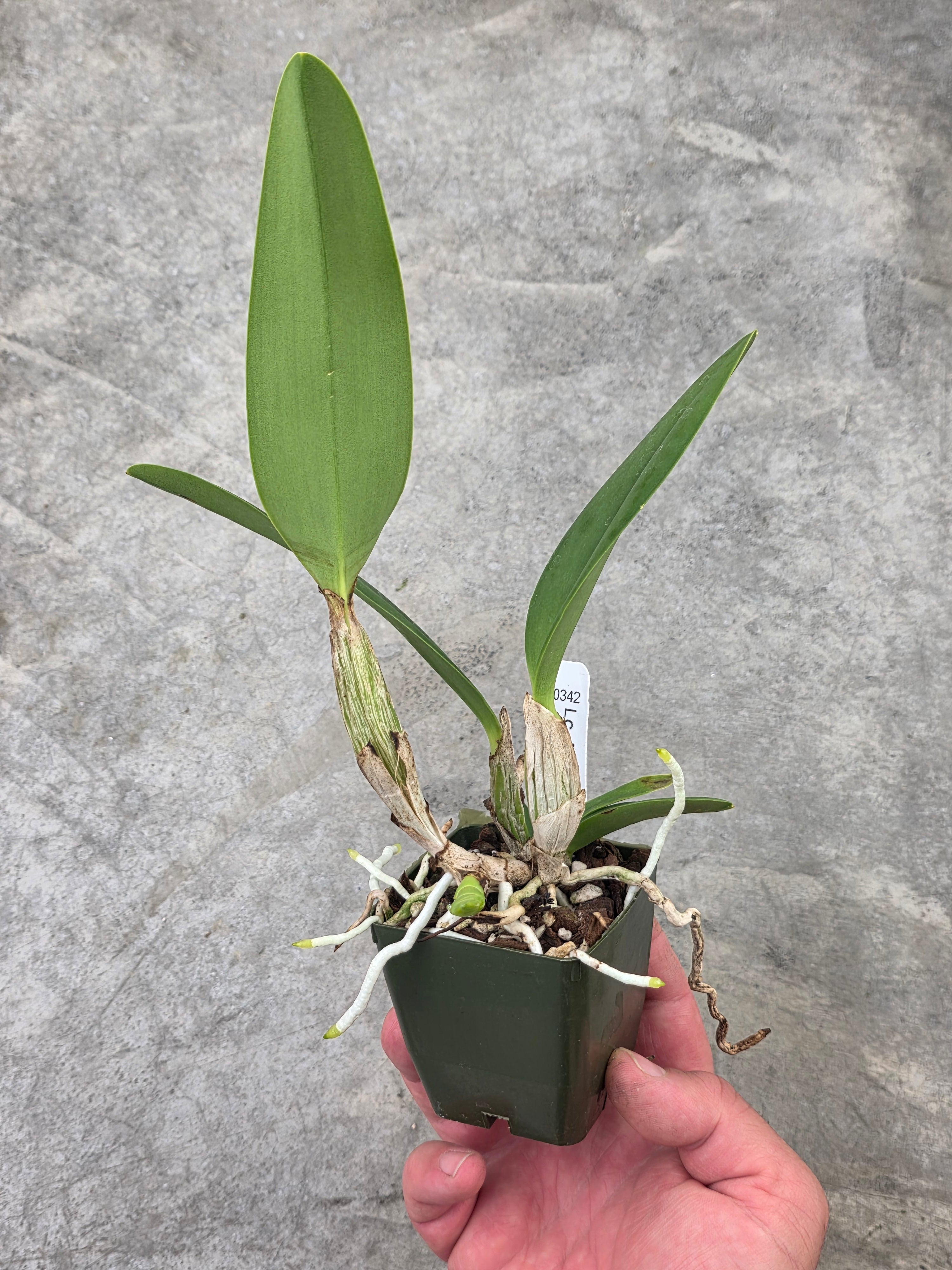 This is an outstanding hybrid that produces many fine cultivars. All of these will have coerulea petals and sepals with dark blue lips and a yellow spot in the throat. The plants will be mini-Catts standing barely 6” tall with flowers 3.5” across. This is a really good cross! We also made this with the parents in the reverse order (a reciprocal cross) – see SVO 10772. It’s always interesting to see compare results from reciprocal crosses using the same parents.