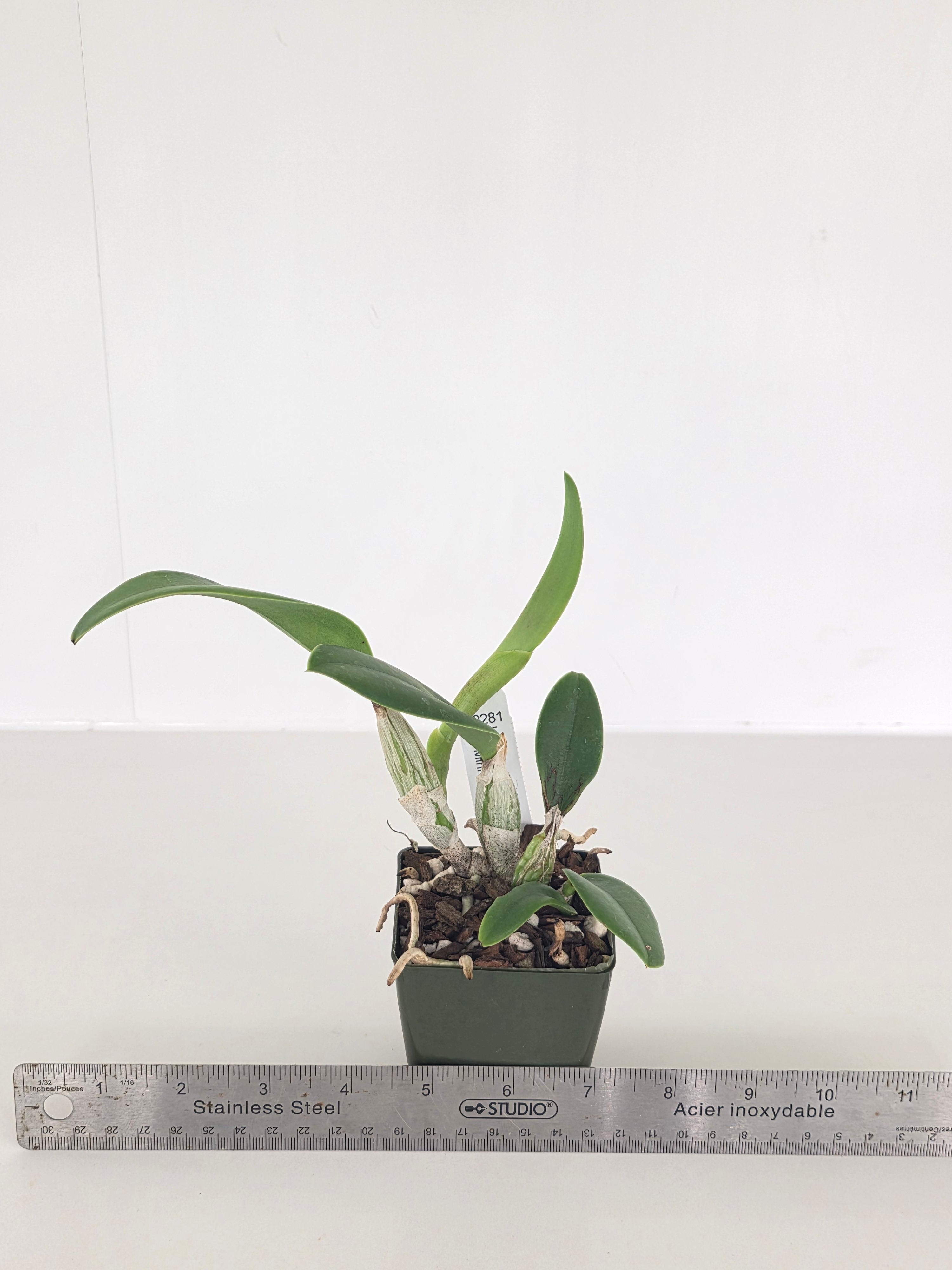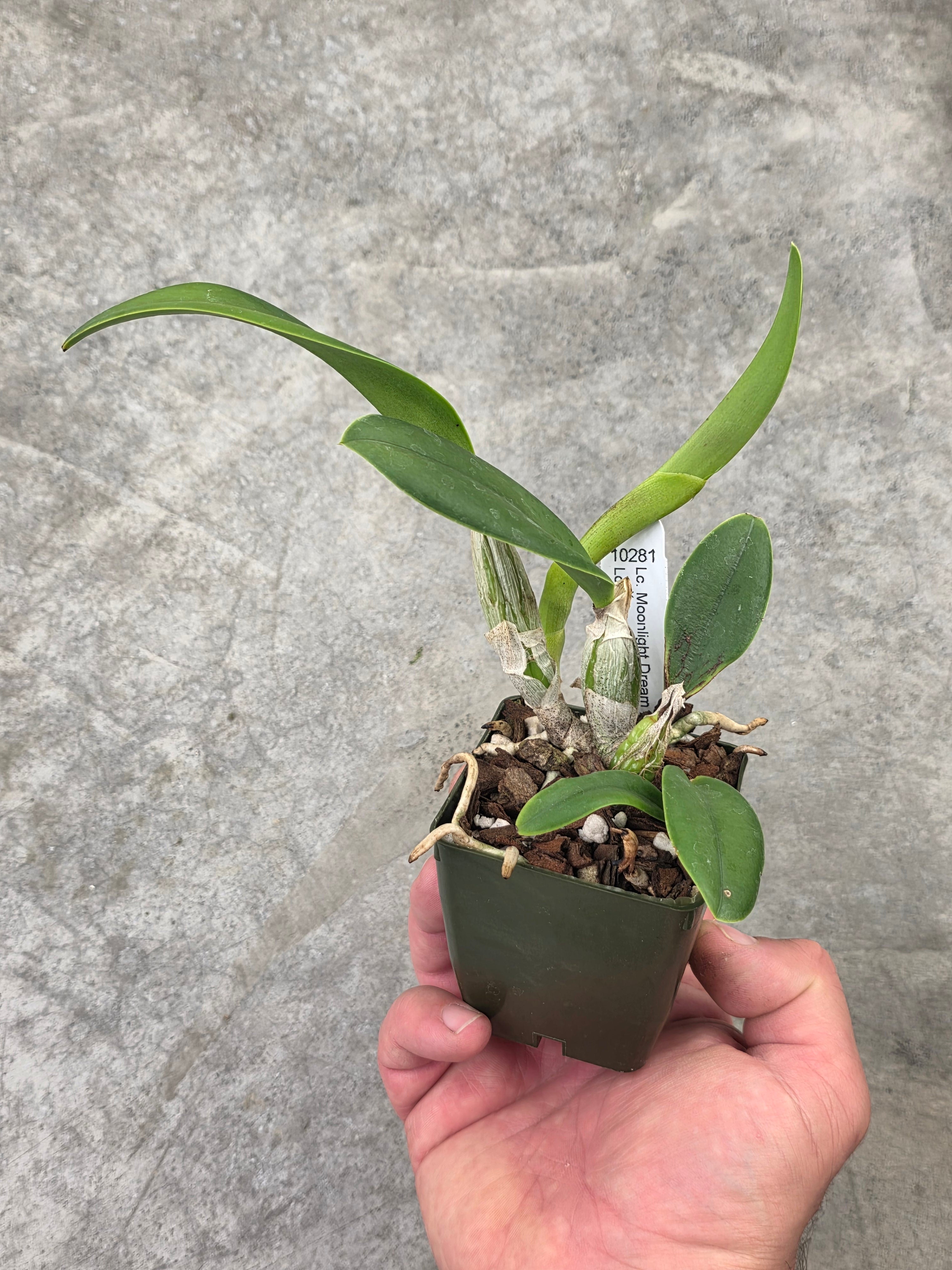 Moonlight Dream (C. Love Knot x C. intermedia f. aquinii) is a compact grower with fantastic, coeruela flared flower. Unusually for a coerulea, it blooms in early March, which is quite early. Mini Purple is also a March bloomer with a second flowering in July. About 50 % of the cross will be flared, and all will flower in early March and possibly again in summer. Plants will be mini-Catts with large flowers compared to the plant size.